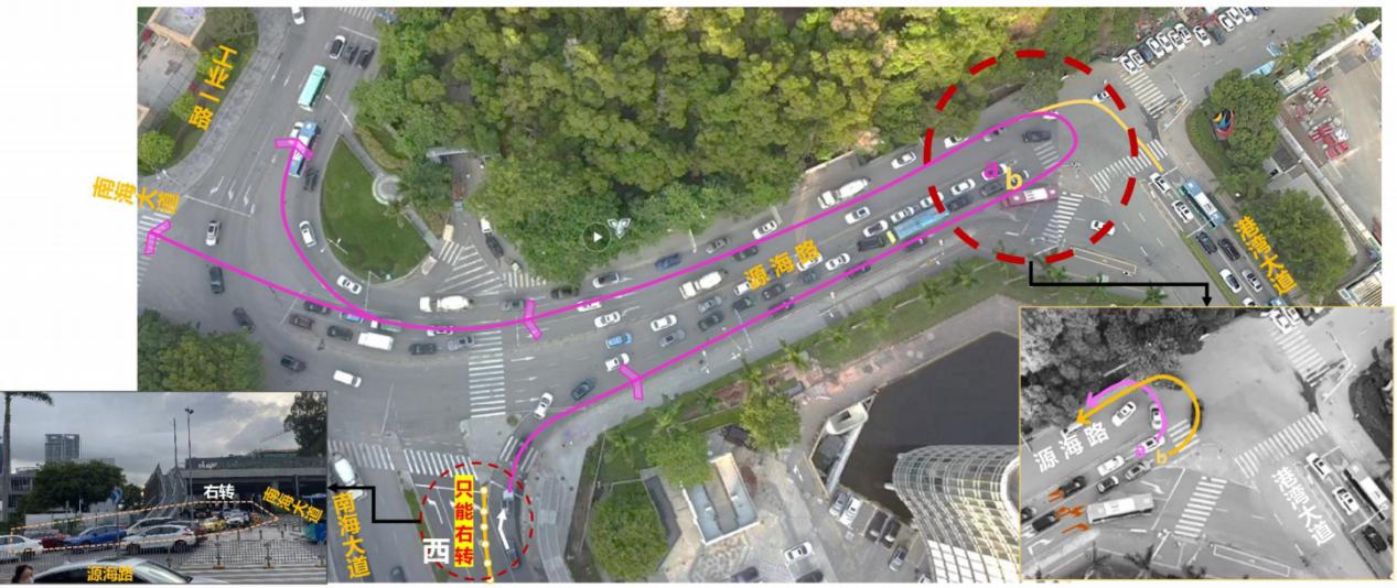 南山區(qū)南海大道時(shí)間廣場(chǎng)路段是通往蛇口、前海的重要道路,早晚高峰期車流量較大。修地鐵時(shí)在南海大道做了“布袋口臨時(shí)設(shè)施”,南海大道現(xiàn)已經(jīng)恢復(fù)通車,但因臨時(shí)設(shè)施還未及時(shí)拆掉,路口紅綠燈沒(méi)有啟用。加之車道收窄,原本可以快速左轉(zhuǎn)北行的車流被擠成一條右轉(zhuǎn)車道,再擠到老碼頭掉頭,四車道變一車道,導(dǎo)致高峰期多數(shù)車輛爭(zhēng)搶道,既不安全還加劇了擁堵。