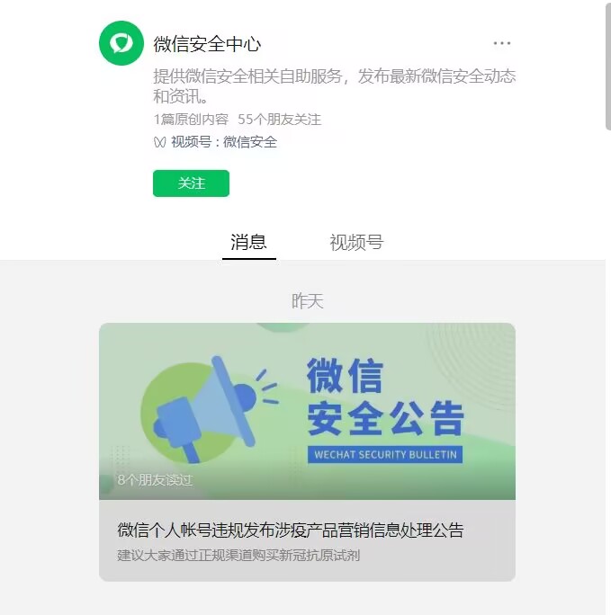 公告強調(diào),“利用微信個人帳號發(fā)布抗原檢測試劑、藥品等營銷信息的行為,違反了相關(guān)法律法規(guī),也違反了《微信個人帳號使用規(guī)范》,微信安全團隊將對違法違規(guī)行為進行堅決處理、嚴厲打擊?!?br/>