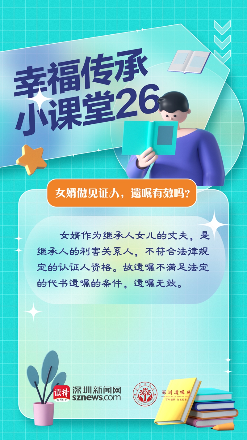 讀特客戶端·深圳新聞網(wǎng)2023年2月9日訊(記者 翁任瑩 張玲)女婿做見證人,這份代書遺囑被判無效,為什么?由廣東嘉得信律師事務(wù)所和深圳新聞網(wǎng)聯(lián)合開設(shè)的幸福傳承小課堂第26期,我們來分析一下遺囑無效的原因。