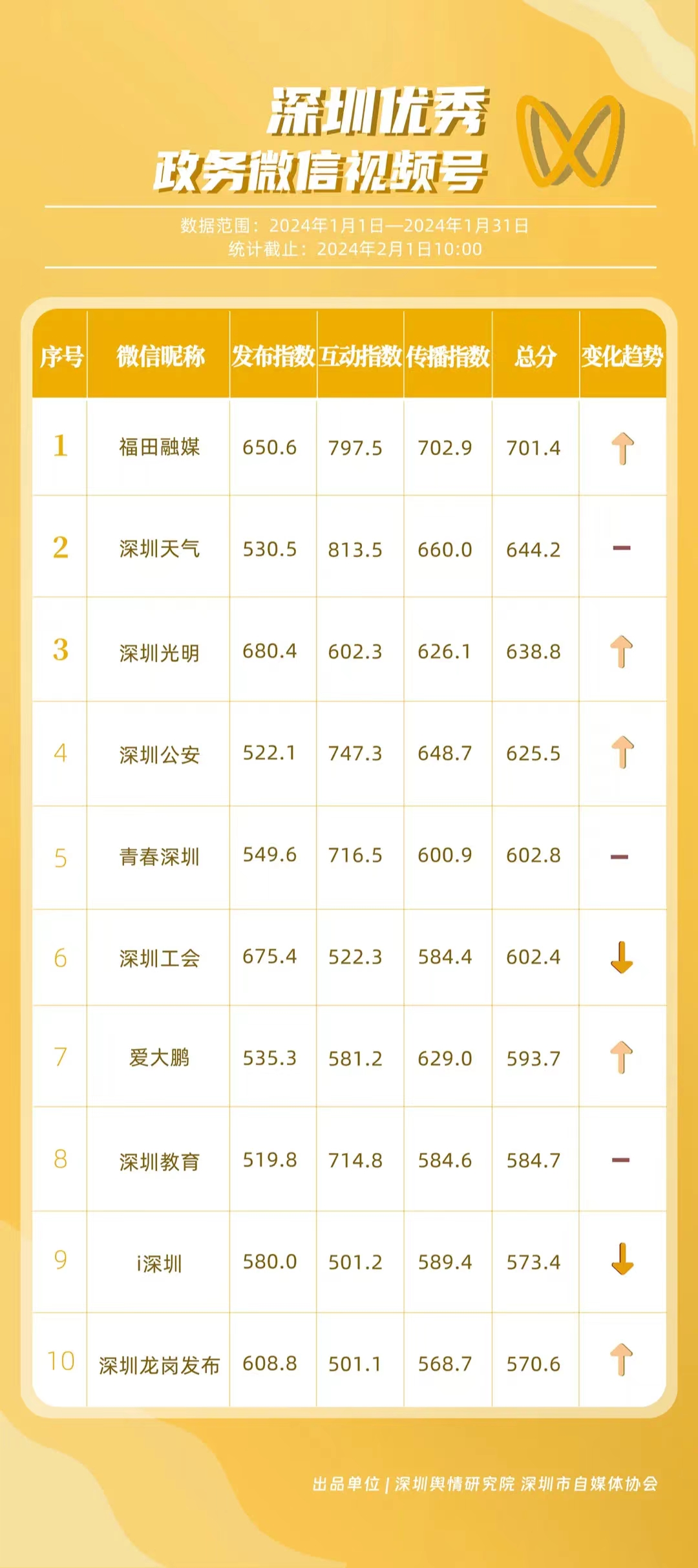 據(jù)悉,《深圳優(yōu)秀政務新媒體矩陣》旨在通過對深圳黨政機關、企事業(yè)單位開設的政務新媒體進行持續(xù)觀察、定期評估,展現(xiàn)政務新媒體的建設管理水平及公眾認可度,同時發(fā)揮好媒體的宣傳監(jiān)督作用。