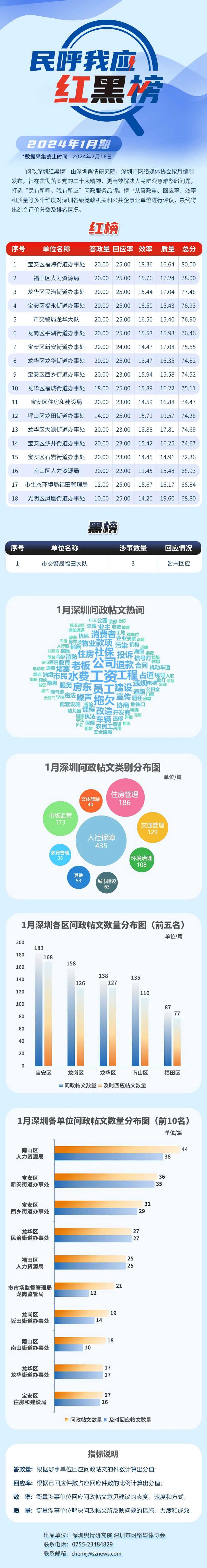 據(jù)悉,本期榜單采集的帖文主要來(lái)自深圳論壇、深圳各區(qū)政府官網(wǎng)、人民網(wǎng)領(lǐng)導(dǎo)留言板等平臺(tái),所采集帖文發(fā)布時(shí)間為2024年1月1日至1月31日。
