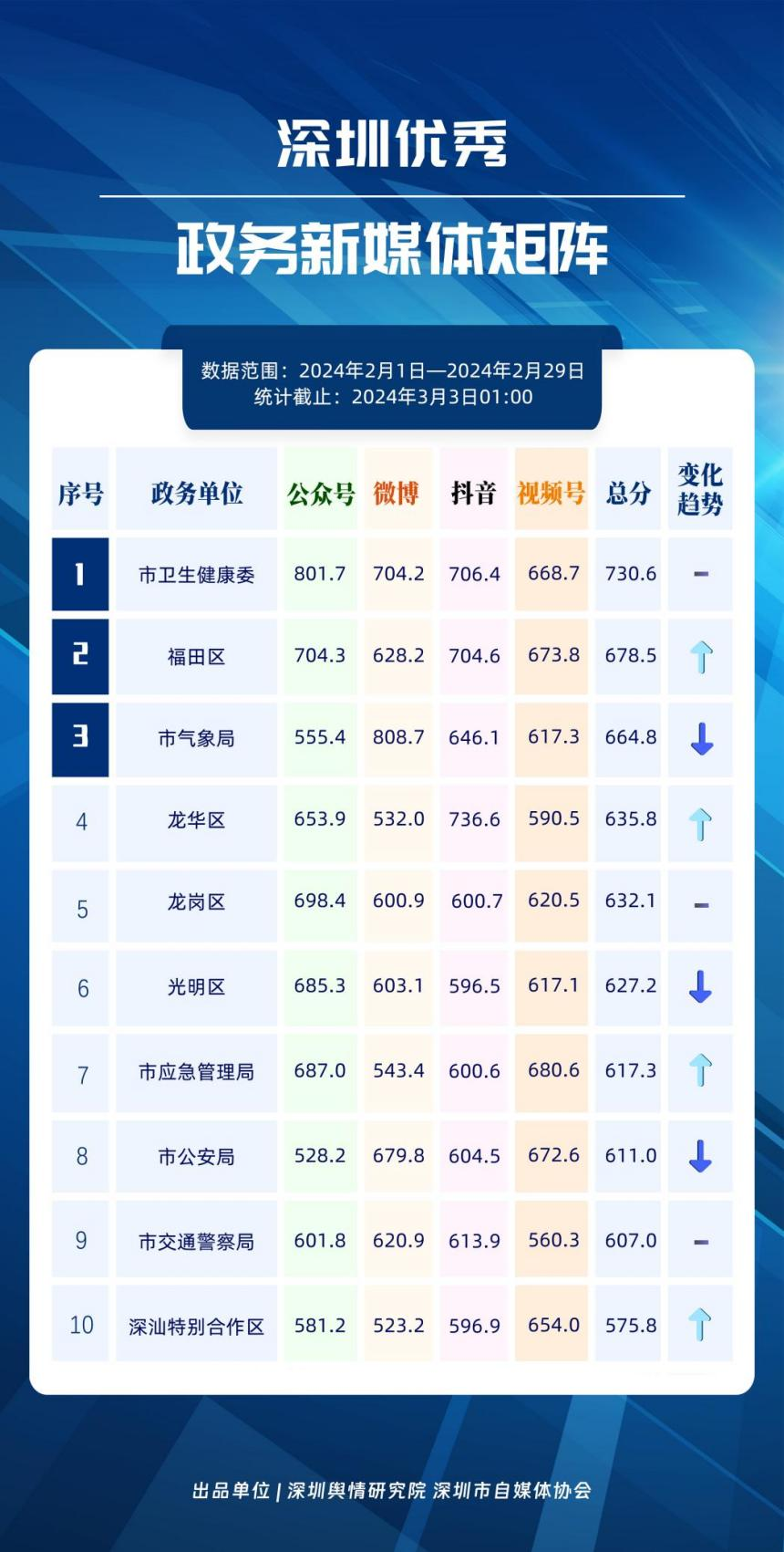 深圳新聞網(wǎng)3月21日訊(記者 陳曉君 實習(xí)生 蔡曉婷)3月19日,深圳輿情研究院、深圳市自媒體協(xié)會聯(lián)合發(fā)布《深圳優(yōu)秀政務(wù)新媒體矩陣》(2月期),市衛(wèi)生健康委、福田區(qū)、市氣象局、龍華區(qū)、龍崗區(qū)、光明區(qū)、市應(yīng)急管理局、市公安局、市交通警察局和深汕特別合作區(qū)新媒體矩陣榮獲“深圳優(yōu)秀政務(wù)新媒體矩陣”稱號。這些新媒體矩陣主要結(jié)合市民實際需求進(jìn)行內(nèi)容創(chuàng)作與更新,推動信息傳播質(zhì)效提升。