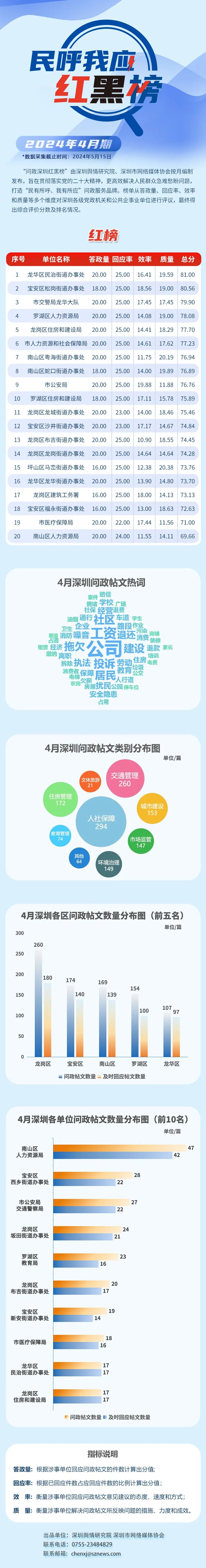 “深圳民呼我應(yīng)紅黑榜”由深圳輿情研究院、深圳市網(wǎng)絡(luò)媒體協(xié)會按月編制發(fā)布,旨在貫徹落實(shí)黨的二十大精神,更高效解決人民群眾急難愁盼問題,打造“民有所呼、我有所應(yīng)”問政服務(wù)品牌。榜單從答政量、回應(yīng)率、效率和質(zhì)量等多個維度對深圳各級黨政機(jī)關(guān)和公共企事業(yè)單位進(jìn)行評議,最終得出綜合評價分?jǐn)?shù)及排名情況。
