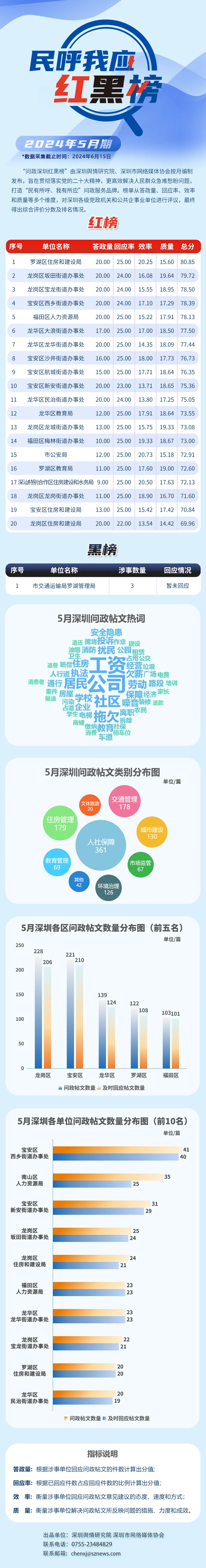 本期榜單采集的帖文主要來自深圳市及各區(qū)政府官網(wǎng)、深圳論壇、人民網(wǎng)領(lǐng)導(dǎo)留言板、深圳新聞網(wǎng)“民呼我應(yīng)”等平臺,所采集帖文發(fā)布時間為2024年5月1日至5月31日,采集截止時間為2024年6月15日。