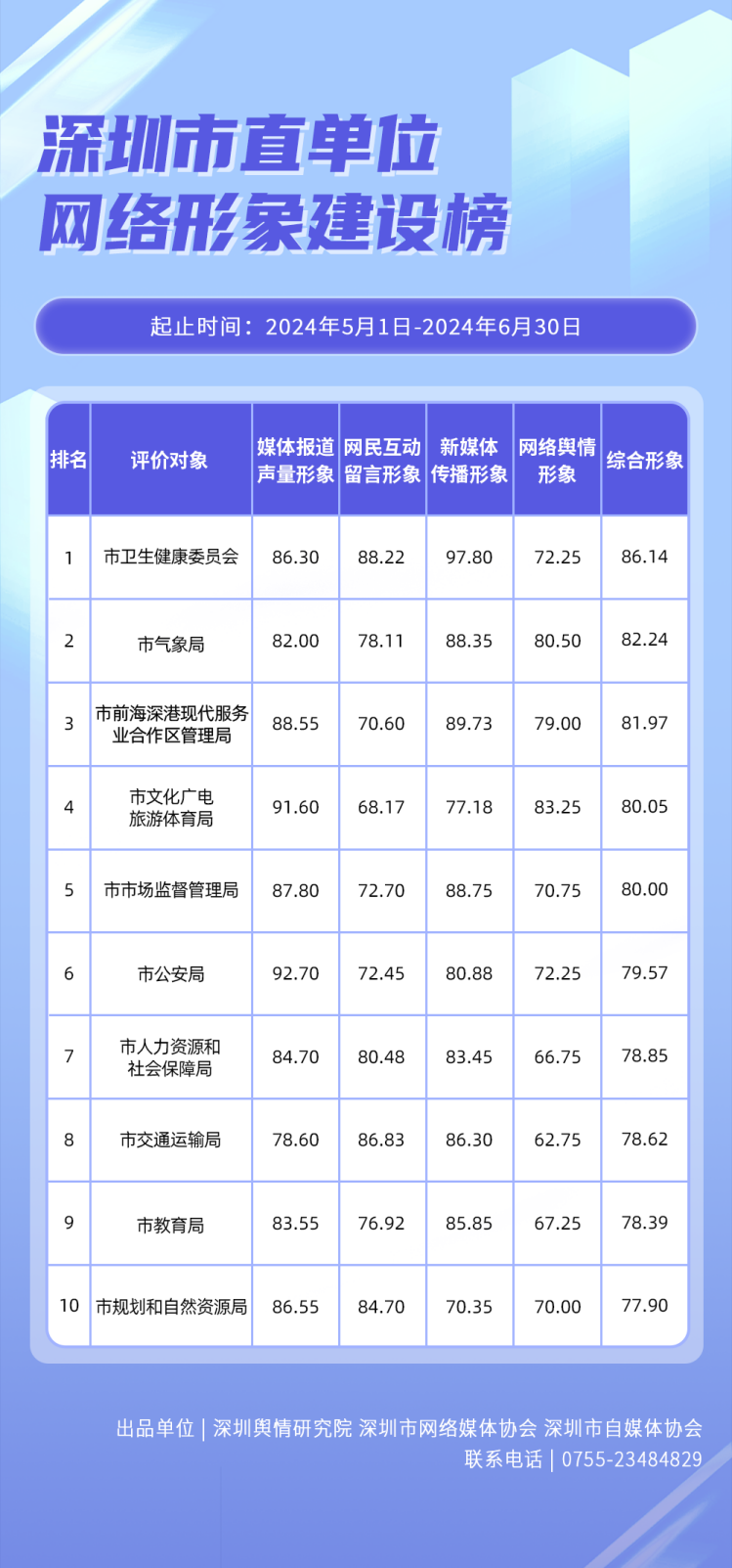 5-6月,市衛(wèi)生健康委員會、市氣象局、市前海深港現代服務業(yè)合作區(qū)管理局、市文化廣電旅游體育局、市市場監(jiān)督管理局、市公安局、市人力資源和社會保障局、市交通運輸局、市教育局、市規(guī)劃和自然資源局在網絡形象建設工作方面表現相對突出,登上《深圳市直單位網絡形象建設榜》。其中,市衛(wèi)生健康委員會、市氣象局、市前海深港現代服務業(yè)合作區(qū)管理局位于榜單前三,堅持服務市民的初心,在市民心中樹立了良好的網絡形象。此外,榜單第四至第十名的單位也在網絡形象的塑造方面取得了較好的效果。