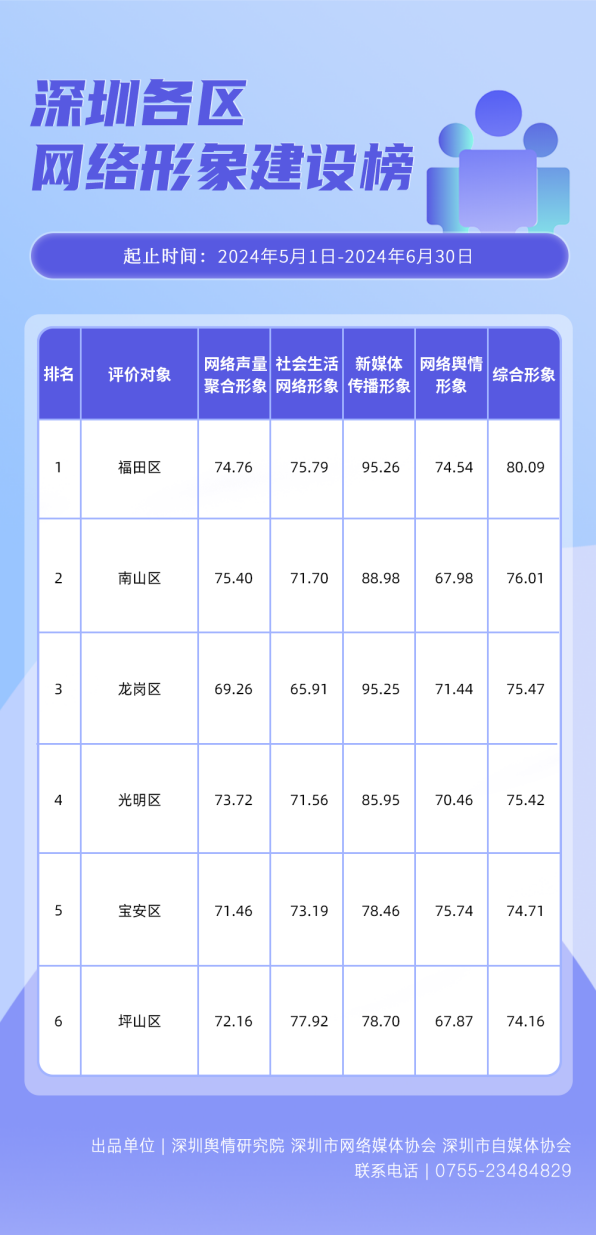 2.《深圳各區(qū)網絡形象建設榜》從深圳各區(qū)的網絡聲量聚合形象(100分)、社會生活網絡形象(100分)、新媒體傳播形象(100分)、網絡輿情形象(100分)四個維度展開綜合評價、計分排名,最終形成榜單。