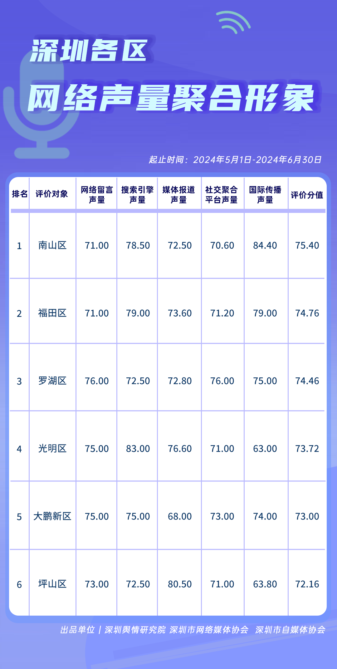 5-6月,大鵬新區(qū)登上《深圳各區(qū)社會生活網絡形象榜》榜首,其消費、居住、教育、環(huán)境形象得分均在80分以上,綜合評價分值領先,這不僅反映了大鵬新區(qū)在網絡形象治理方面的全面投入,也顯示出其在提升居民生活質量、營造和諧宜居環(huán)境方面取得的顯著成效。緊隨其后的是坪山區(qū),以77.92分的評價分值位列第二,尤其在居住、教育形象兩方面獲得較高評分,凸顯其在社會生活網絡形象塑造上的卓越表現。位于榜單第三至第六名的深汕特別合作區(qū)、福田區(qū)、鹽田區(qū)、寶安區(qū)綜合評價分值均在73分以上,充分證明了這些區(qū)域在構建積極的社會生活網絡形象上所做的不懈努力和取得的成果。上榜區(qū)域的優(yōu)異表現不僅是對其綜合實力的認可,也是它們持續(xù)提升居民生活質量、營造和諧宜居環(huán)境的有力證明。