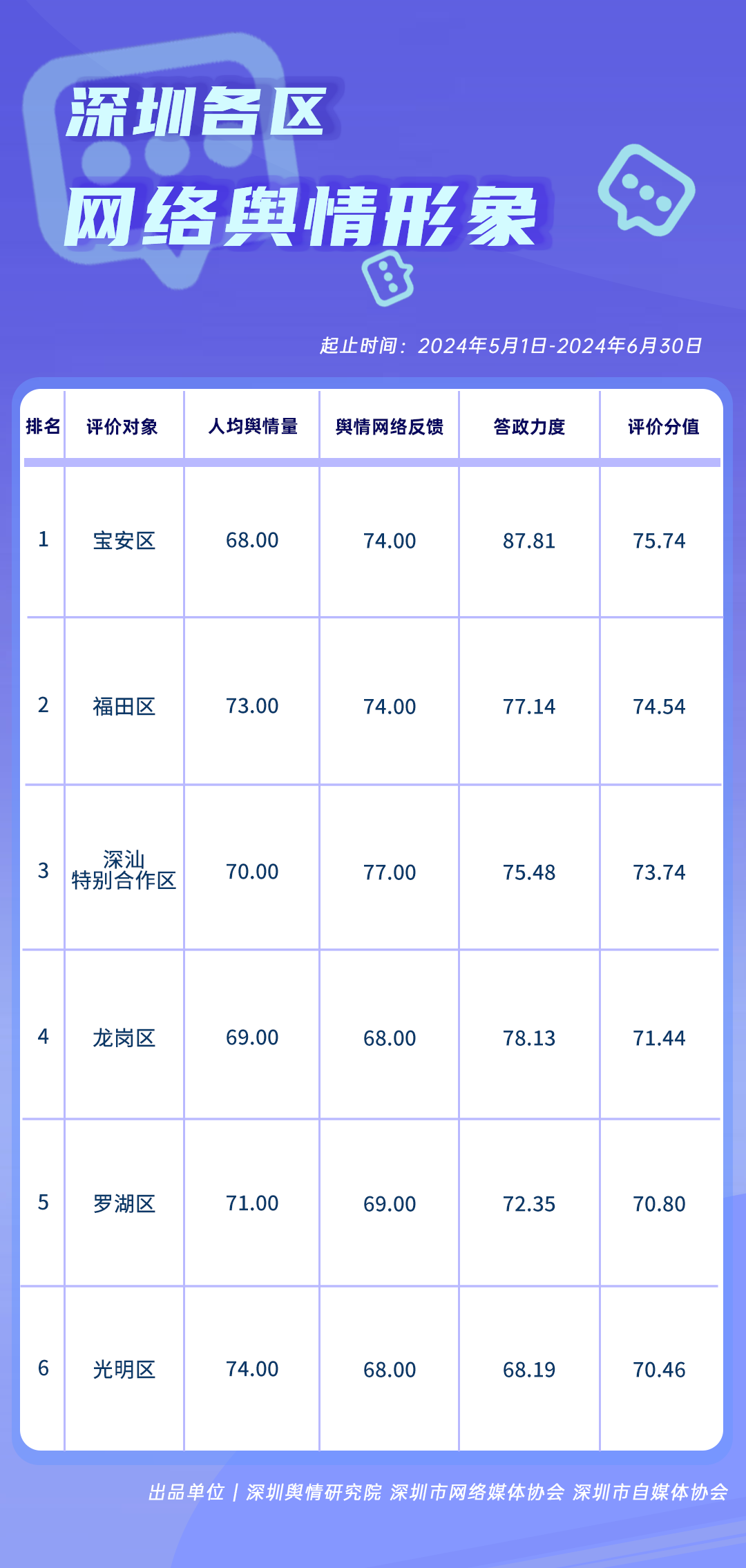 在《深圳各區(qū)網絡輿情形象榜》中,寶安區(qū)以75.74分的高分榮登榜首,其在答政力度上的表現尤為突出,得分高達87.81分,這充分展現了寶安區(qū)對網絡問政工作的重視程度。緊隨其后的是福田區(qū),以74.54分的評價分值位列第二。福田區(qū)在輿情處置相關的多個評價指標上均表現出色,每項指標得分均超過73分。深汕特別合作區(qū)、龍崗區(qū)、羅湖區(qū)和光明區(qū)則分別位列第三至第六名。這些區(qū)域同樣展現出對民眾聲音的高度重視,將民意視為改進工作的重要參考,并且積極采取措施主動回應民眾關切,體現了其在網絡輿情管理上的積極態(tài)度和有效策略。