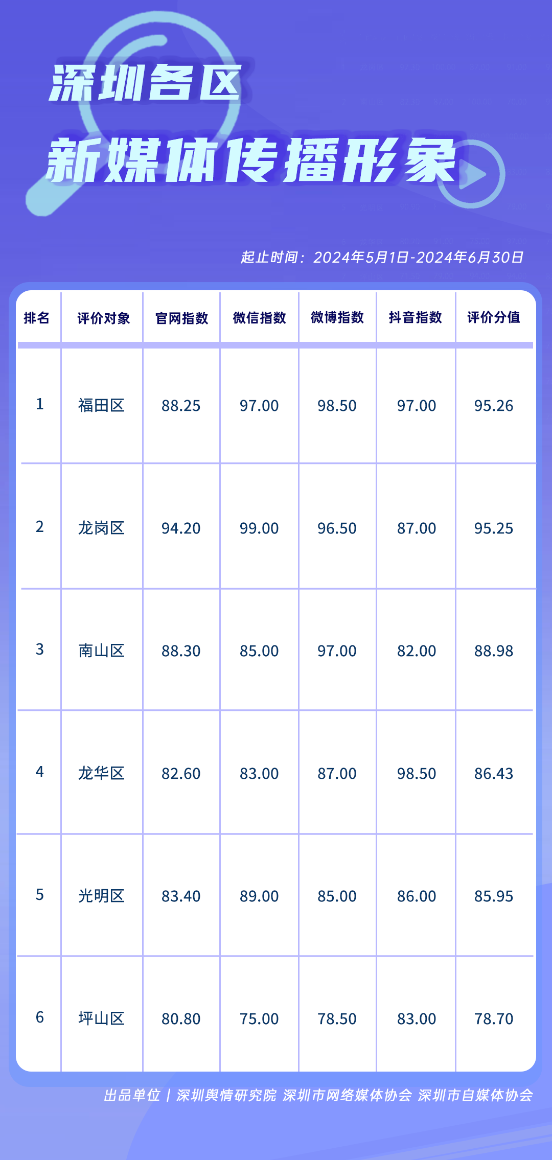 5-6月,在《深圳各區(qū)新媒體傳播形象榜》中,福田區(qū)、龍崗區(qū)、南山區(qū)、龍華區(qū)、光明區(qū)、坪山區(qū)均展現了出色的表現,成功躋身榜單前六強。其中福田區(qū)、龍崗區(qū)超過95分的高分表現尤為搶眼,反映出兩區(qū)在新媒體傳播上的深度投入和創(chuàng)新實踐。南山區(qū)則以88.98分的成績,榮獲榜單第三名,顯示出其在提升新媒體傳播能力方面的不懈努力。龍華區(qū)、光明區(qū)和坪山區(qū)緊隨其后,分別位列第四至第六名,表明這些區(qū)域同樣在新媒體傳播領域不斷探索和深化工作,尋求創(chuàng)新的方式來提升自身的新媒體形象。整體來看,上榜區(qū)域的新媒體傳播工作不僅提升了信息傳播效率,也為塑造深圳各區(qū)的正面形象做出了積極貢獻。