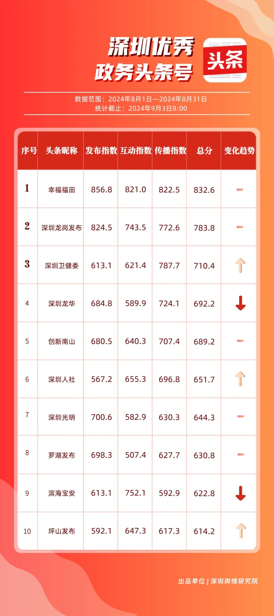 8月,“幸福福田”“深圳龍崗發(fā)布”“深圳衛(wèi)健委”“深圳龍華”“創(chuàng)新南山”“深圳人社”“深圳光明”“羅湖發(fā)布”“濱海寶安”和“坪山發(fā)布”共10個政務(wù)頭條號入選榜單。相關(guān)賬號的文章《“為愛瘋狂,怎么3天后‘下面’喜提美乃滋?”》《最新消息!價格即將調(diào)整!時間就在→》等貼近民生,傳遞實用信息,收獲了較高的閱讀量和點贊數(shù)。