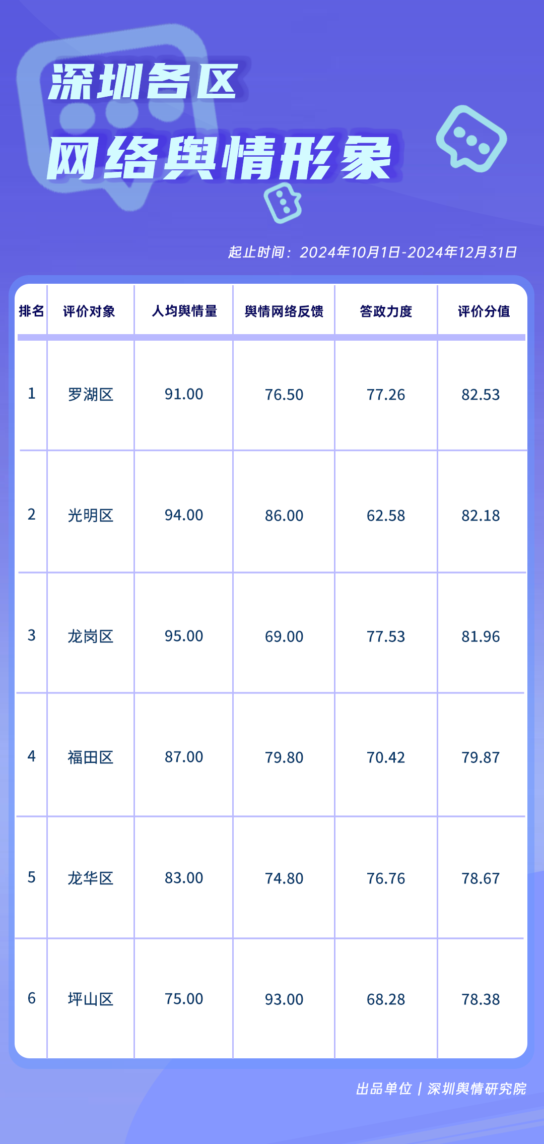 網(wǎng)絡(luò)輿情方面,羅湖區(qū)、光明區(qū)、龍崗區(qū)得分在80分以上,登上《深圳各區(qū)網(wǎng)絡(luò)輿情形象榜》前三名,福田區(qū)、龍華區(qū)、坪山區(qū)以超過75分的綜合評(píng)價(jià)分值上榜,體現(xiàn)出各區(qū)在維護(hù)良好網(wǎng)絡(luò)輿情生態(tài)、快速響應(yīng)網(wǎng)民關(guān)切等方面的積極態(tài)度。