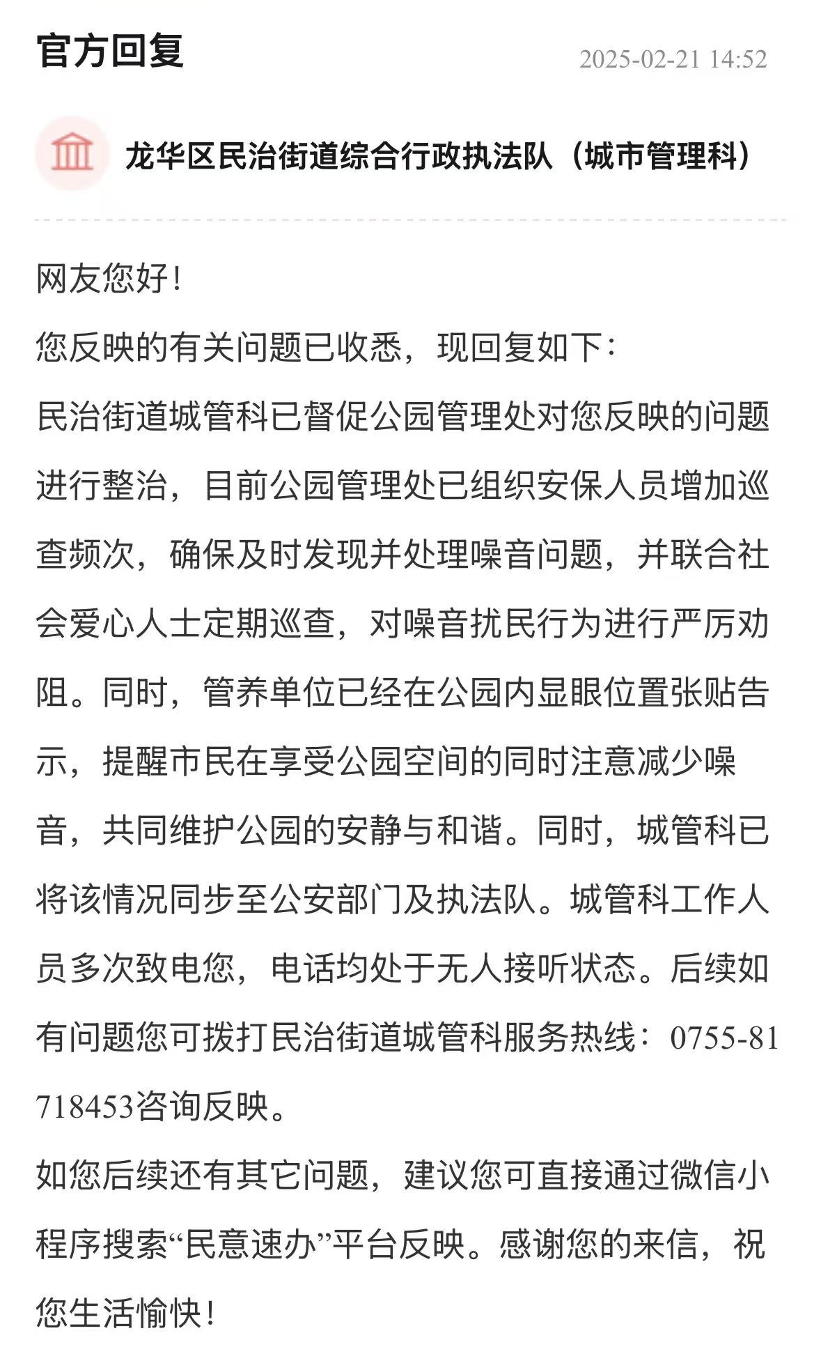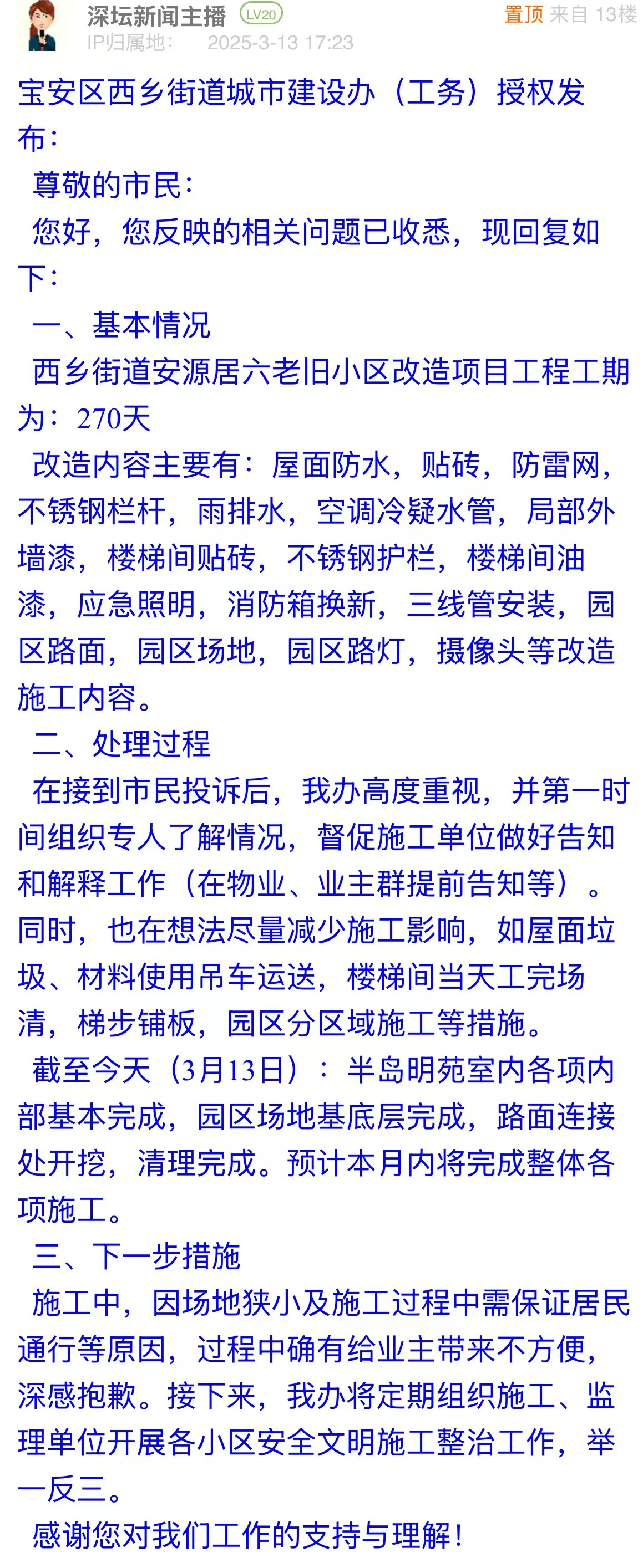 案例點評:市民投訴后,街道辦快速介入,做好信息公開及解釋工作,表示工程正在穩(wěn)步推進,并協(xié)助優(yōu)化施工流程,體現(xiàn)了主動作為的態(tài)度,保障居民知情權(quán)與參與權(quán)?;貞?yīng)中,街道辦還承諾將舉一反三,減少類似問題出現(xiàn),是對未來工作的深遠規(guī)劃,真正為民生工程贏得群眾滿意而努力,值得推廣。