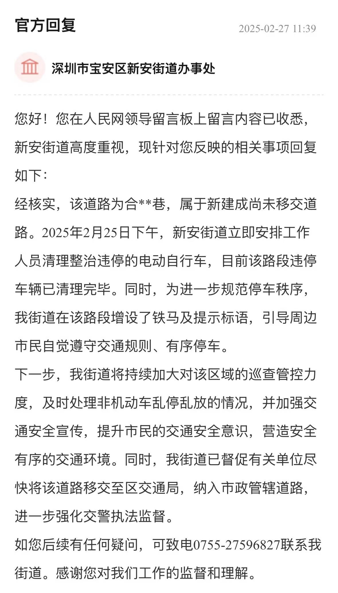 案例點評:街道辦針對車輛管理、消防問題多管齊下,旨在營造一個通暢、安全的出行和生活環(huán)境,態(tài)度值得肯定?;貞?yīng)展示了街道辦構(gòu)建的“專項巡查+設(shè)施建設(shè)+行為引導(dǎo)”綜合治理體系,精準(zhǔn)直擊問題核心,兼顧當(dāng)下整治與長遠規(guī)劃,切實保障居民居住和生活安全,其系統(tǒng)性解決思路對同類區(qū)域治理具有重要參考價值。