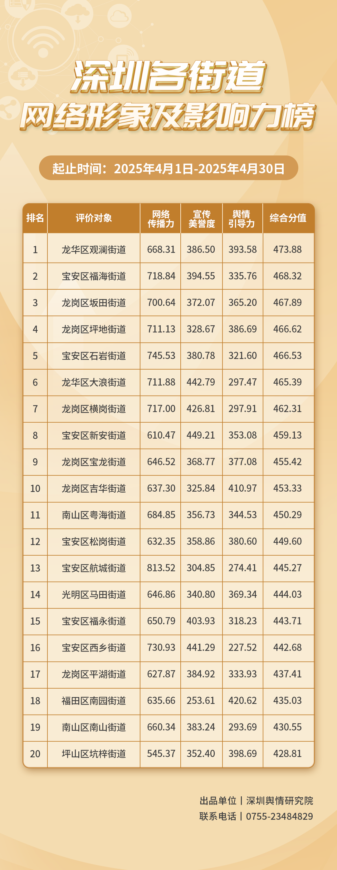 2025年4月,共有20個街道登上《深圳各街道網(wǎng)絡(luò)形象及影響力榜》,分別是:龍華區(qū)觀瀾街道、寶安區(qū)福海街道、龍崗區(qū)坂田街道、龍崗區(qū)坪地街道、寶安區(qū)石巖街道、龍華區(qū)大浪街道、龍崗區(qū)橫崗街道、寶安區(qū)新安街道、龍崗區(qū)寶龍街道、龍崗區(qū)吉華街道、南山區(qū)粵海街道、寶安區(qū)松崗街道、寶安區(qū)航城街道、光明區(qū)馬田街道、寶安區(qū)福永街道、寶安區(qū)西鄉(xiāng)街道、龍崗區(qū)平湖街道、福田區(qū)南園街道、南山區(qū)南山街道、坪山區(qū)坑梓街道。