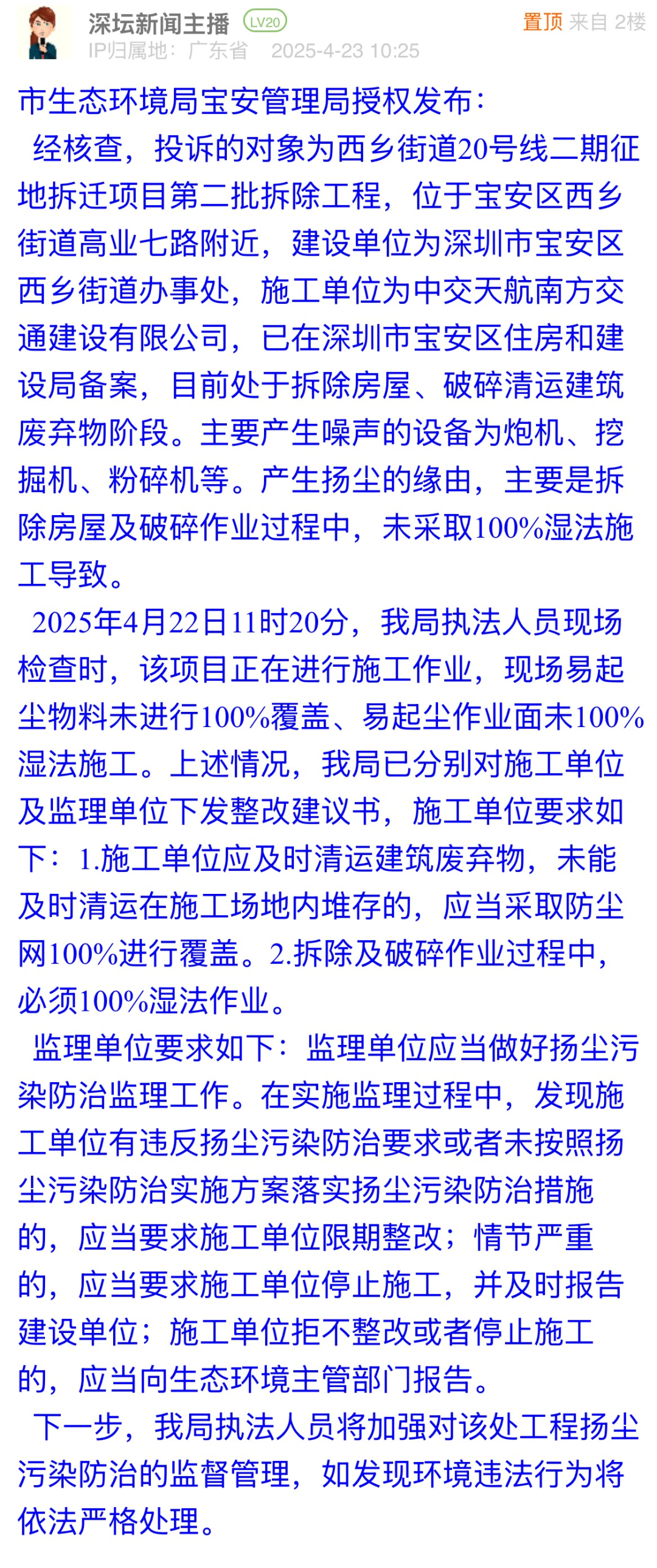 市民反映工地未落實(shí)降塵措施問(wèn)題,直接關(guān)乎周邊環(huán)境質(zhì)量,生態(tài)環(huán)境局寶安管理局快速響應(yīng),第一時(shí)間核查鎖定責(zé)任主體,明確施工與監(jiān)理單位整改要求,回應(yīng)既及時(shí)又切中要害。從問(wèn)題反饋到措施落地的全流程,體現(xiàn)了該局對(duì)市民訴求的高度重視,更展現(xiàn)出生態(tài)監(jiān)管部門“民有所呼、立行立改”的責(zé)任擔(dān)當(dāng),切實(shí)守護(hù)市民的呼吸安全。