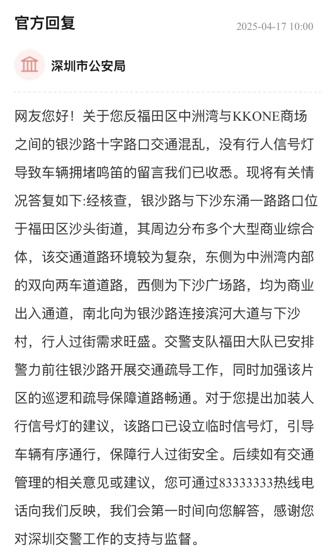 案例點(diǎn)評(píng):商圈周邊商業(yè)密集、道路結(jié)構(gòu)復(fù)雜,面對(duì)市民反映問(wèn)題,市公安局交通警察局一方面安排警力現(xiàn)場(chǎng)疏導(dǎo),另一方面根據(jù)實(shí)際情況,設(shè)立臨時(shí)信號(hào)燈,引導(dǎo)行人安全過(guò)街,車輛有序通行。雖未立即加裝固定信號(hào)燈,但該局以“應(yīng)急處置、靈活調(diào)整”的務(wù)實(shí)方式解決燃眉之急,此類快速響應(yīng)與因地制宜的處置模式,為商圈復(fù)雜路口交通管理提供范本。