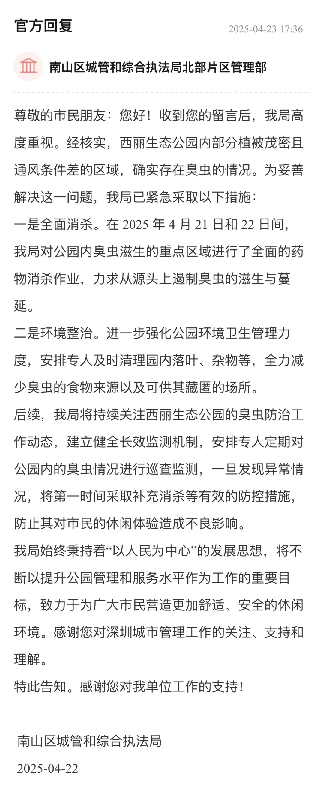 案例點(diǎn)評(píng):臭蟲侵?jǐn)_住戶問(wèn)題與居民生活舒適度息息相關(guān)。南山區(qū)城管部門快速響應(yīng),在問(wèn)題反饋后48小時(shí)內(nèi)即開展消殺,遏制臭蟲蔓延;同步強(qiáng)化環(huán)境整治,切斷滋生鏈條。更值得肯定的是,回應(yīng)中還表示將建立健全長(zhǎng)效監(jiān)測(cè)機(jī)制,動(dòng)態(tài)跟蹤蟲情并及時(shí)采取措施,充分體現(xiàn)出該局問(wèn)題發(fā)現(xiàn)快、處置措施實(shí)、長(zhǎng)效保障穩(wěn)的務(wù)實(shí)作風(fēng)。