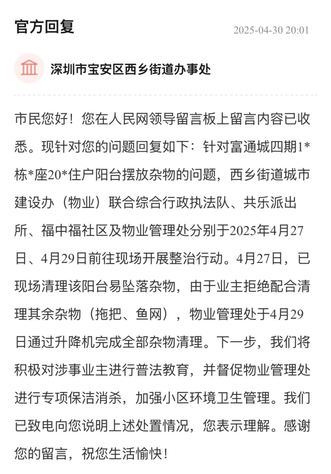 陽(yáng)臺(tái)懸掛雜物影響居住環(huán)境問(wèn)題,關(guān)乎社區(qū)環(huán)境品質(zhì)與鄰里和諧,街道辦聯(lián)動(dòng)多部門快速響應(yīng),面對(duì)業(yè)主不配合的情況,以“柔性溝通+硬性執(zhí)行”破解處置難點(diǎn)。后續(xù)計(jì)劃的普法教育、保潔消殺則構(gòu)建了“整治-教育-長(zhǎng)效”管理方式,守護(hù)了居民居住環(huán)境整潔,更彰顯“民有所呼、事必快辦”的基層治理?yè)?dān)當(dāng)。