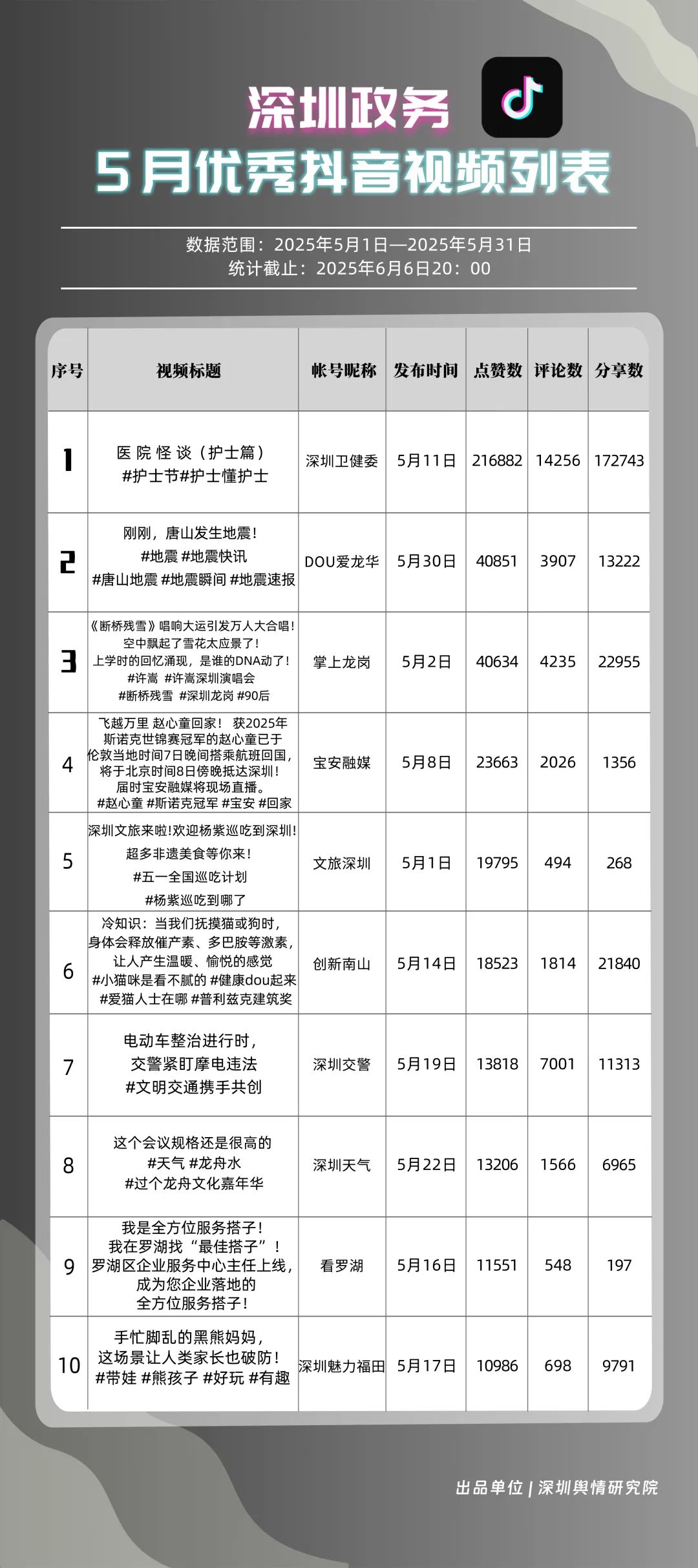2025年5月期《深圳優(yōu)秀政務(wù)新媒體矩陣》發(fā)布,讓我們共同關(guān)注哪些矩陣以精準(zhǔn)傳播、智慧服務(wù)與創(chuàng)新實(shí)踐,在政務(wù)新媒體領(lǐng)域打造出具有示范價(jià)值的標(biāo)桿案例,以矩陣合力構(gòu)建政務(wù)傳播新生態(tài),為深圳城市網(wǎng)絡(luò)形象塑造持續(xù)注入新動(dòng)能。