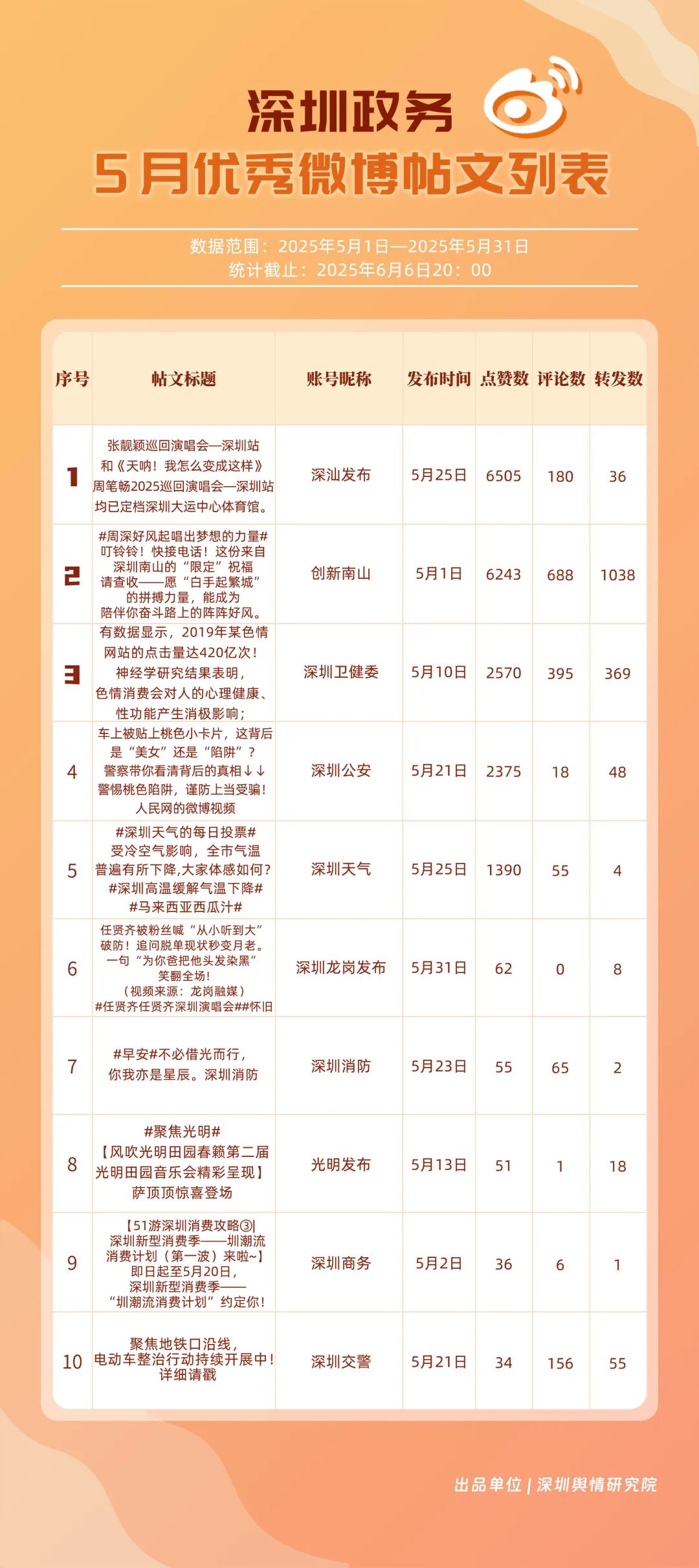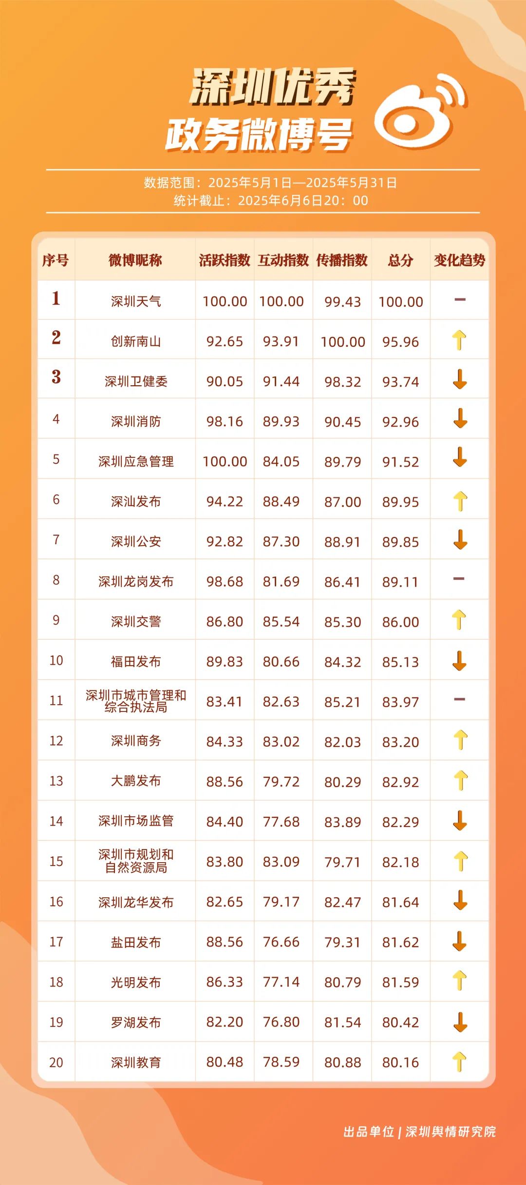 5月,“深圳天氣”“創(chuàng)新南山”“深圳衛(wèi)健委”“深圳消防”“深圳應(yīng)急管理”“深汕發(fā)布”“深圳公安”“深圳龍崗發(fā)布”“深圳交警”“福田發(fā)布”等20個(gè)賬號(hào)入選“優(yōu)秀政務(wù)微博號(hào)”。其中,“深圳天氣”憑借活躍指數(shù)和互動(dòng)指數(shù)雙項(xiàng)滿分的亮眼成績(jī),穩(wěn)居榜單首位。“創(chuàng)新南山”以95.96分緊隨其后,在互動(dòng)、傳播指數(shù)得分大幅提升,排名實(shí)現(xiàn)顯著躍升。“深圳衛(wèi)健委”“深圳消防”“深圳應(yīng)急管理”也表現(xiàn)卓越,總分均超過90分,它們憑借權(quán)威信息發(fā)布、專業(yè)知識(shí)科普,展現(xiàn)了各單位在民生服務(wù)、公共安全領(lǐng)域的重要作用。以上優(yōu)秀政務(wù)微博號(hào)深度契合平臺(tái)的傳播特征,善于借助熱門話題擴(kuò)大影響力,以鮮明的賬號(hào)特色展現(xiàn)區(qū)域風(fēng)采。