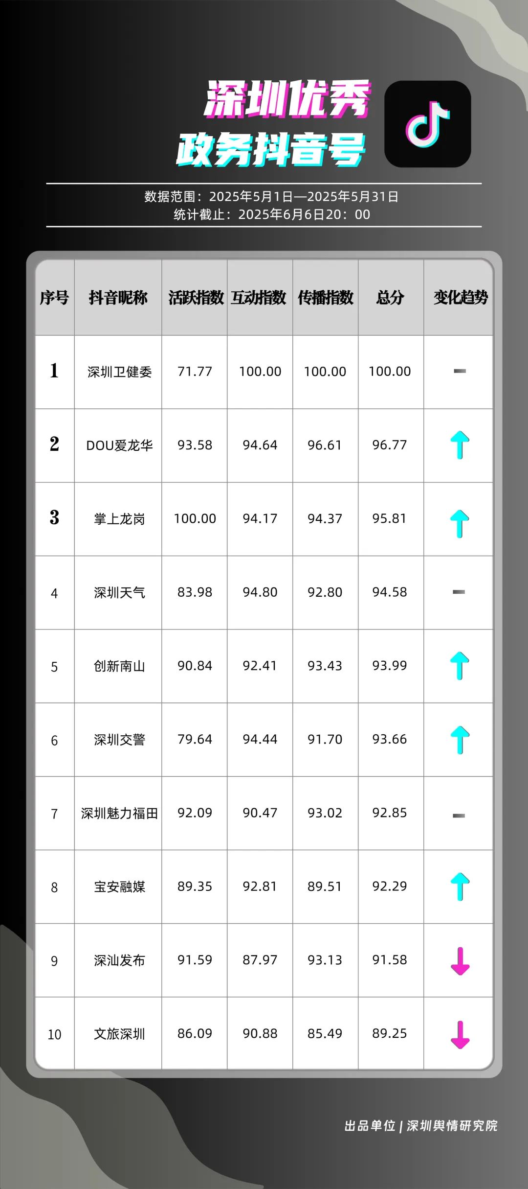 5月,“深圳衛(wèi)健委”“DOU愛龍華”“掌上龍崗”“深圳天氣”“創(chuàng)新南山”“深圳交警”“深圳魅力福田”“寶安融媒”“深汕發(fā)布”“文旅深圳”共10個(gè)政務(wù)抖音號(hào)獲得“優(yōu)秀政務(wù)抖音號(hào)”稱號(hào)。5月,“深圳衛(wèi)健委”憑借3條極具創(chuàng)意的視頻內(nèi)容持續(xù)收獲網(wǎng)民關(guān)注,穩(wěn)居榜首之位,成為政務(wù)抖音號(hào)領(lǐng)域的標(biāo)桿?!癉OU愛龍華”“掌上龍崗”較上個(gè)月排名大幅度上升,以96.77分和95.81分位居榜單第2、3名,彰顯出積極探索創(chuàng)新傳播路徑、開拓政務(wù)短視頻發(fā)展新可能的決心。以上優(yōu)秀政務(wù)抖音號(hào)通過多樣化的短視頻形式傳遞政務(wù)資訊,為深圳政務(wù)新媒體在短視頻領(lǐng)域的蓬勃發(fā)展注入強(qiáng)勁動(dòng)能,成為政務(wù)信息傳播的新標(biāo)桿。