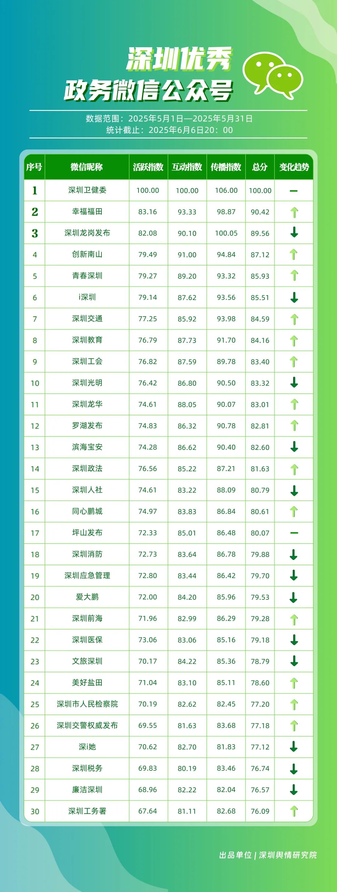 5月,30個(gè)政務(wù)微信公眾號(hào)入選“深圳優(yōu)秀政務(wù)微信公眾號(hào)”榜單,其中包括“深圳衛(wèi)健委”“幸福福田”“深圳龍崗發(fā)布”“創(chuàng)新南山”“青春深圳”“i深圳”“深圳交通”“深圳教育”“深圳工會(huì)”“深圳光明”等。其中,“深圳衛(wèi)健委”在活躍、互動(dòng)、傳播3項(xiàng)指標(biāo)上獲得滿分,其亮眼數(shù)據(jù)彰顯了內(nèi)容創(chuàng)作的高質(zhì)量,位居榜單首位?!靶腋8L铩蓖瑯颖憩F(xiàn)出色,排名較上個(gè)月有所上升,以總分90.42的優(yōu)異成績(jī)位居榜單第2名;“深圳龍崗發(fā)布”“創(chuàng)新南山”“青春深圳”緊隨其后,以新穎的互動(dòng)形式吸引用戶參與,表現(xiàn)值得肯定。上榜賬號(hào)充分發(fā)揮微信公眾平臺(tái)的傳播優(yōu)勢(shì),以豐富多元的內(nèi)容形態(tài)、生動(dòng)鮮活的表達(dá)風(fēng)格,持續(xù)為市民提供優(yōu)質(zhì)的信息服務(wù)。