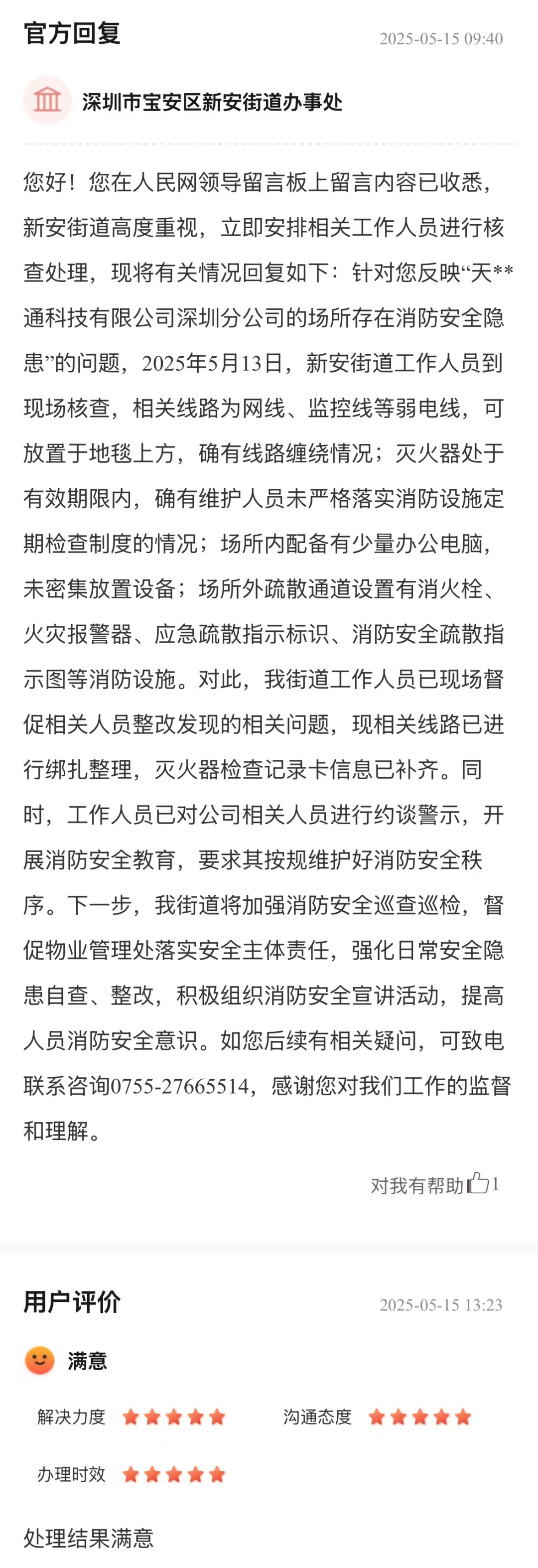 企業(yè)電氣線路混亂、滅火器維護缺位等消防隱患,直接威脅員工生命財產(chǎn)安全,更潛藏重大事故風險。街道辦收到市民反饋后,迅速核查并高效解決現(xiàn)存問題,以“即知即改”的行動力回應(yīng)群眾關(guān)切。后續(xù)通過約談警示、安全宣教等舉措,從“治已病”轉(zhuǎn)向“防未病”,切實筑牢區(qū)域消防安全屏障,展現(xiàn)基層對安全隱患的快速治理能力,傳遞出“民生安全無小事”的責任擔當,獲得網(wǎng)民的五星好評。