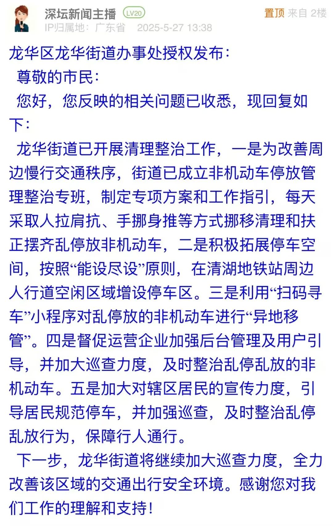 案例點評:地鐵口電動車與共享單車堆積,既阻礙行人通行,更影響區(qū)域交通秩序與城市形象。龍華街道辦接訴后迅速響應(yīng),成立專項整治專班,通過每日清理扶正、增設(shè)停車區(qū)、“掃碼尋車”移管、督促企業(yè)巡查及居民宣傳引導等多維度舉措,破解亂停難題,以“疏堵結(jié)合”的治理智慧,快速行動,綜合施策,為改善區(qū)域交通環(huán)境提供了務(wù)實范本。