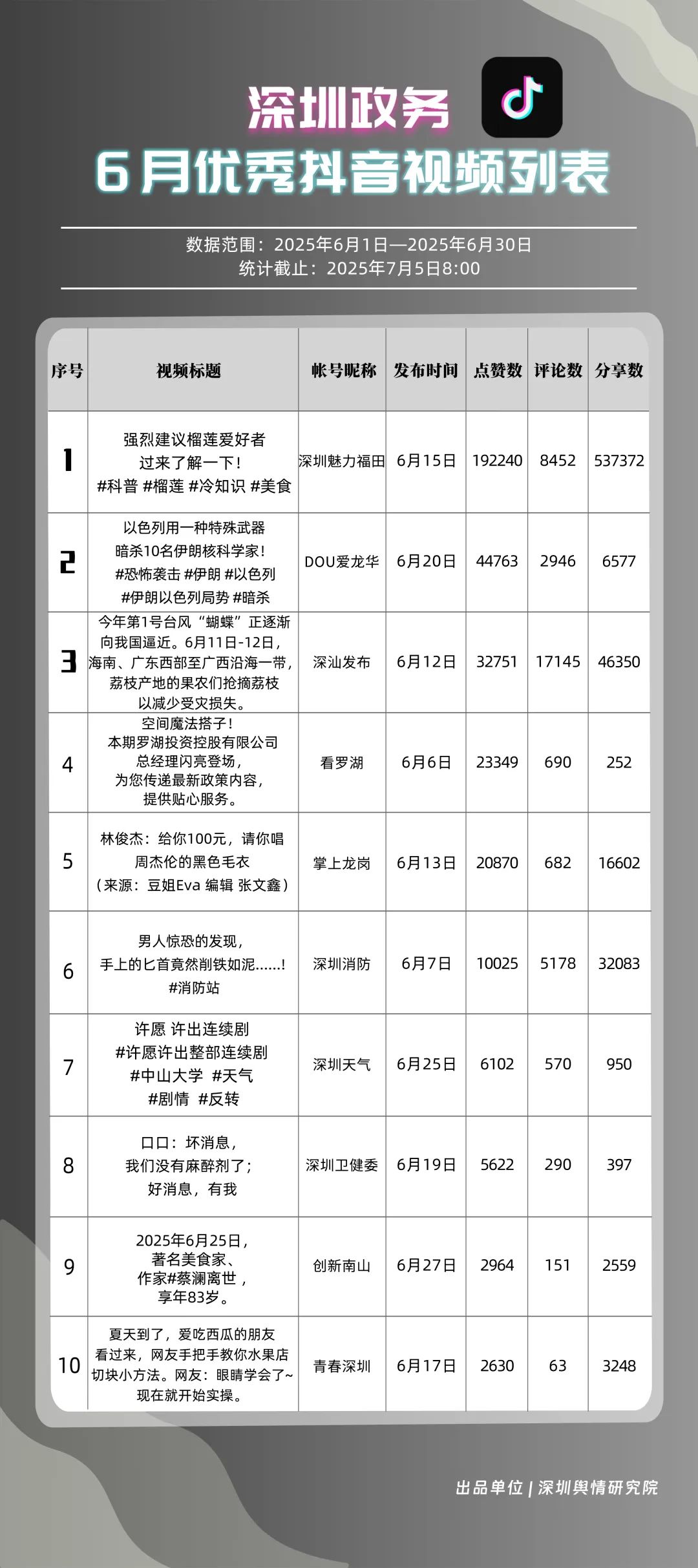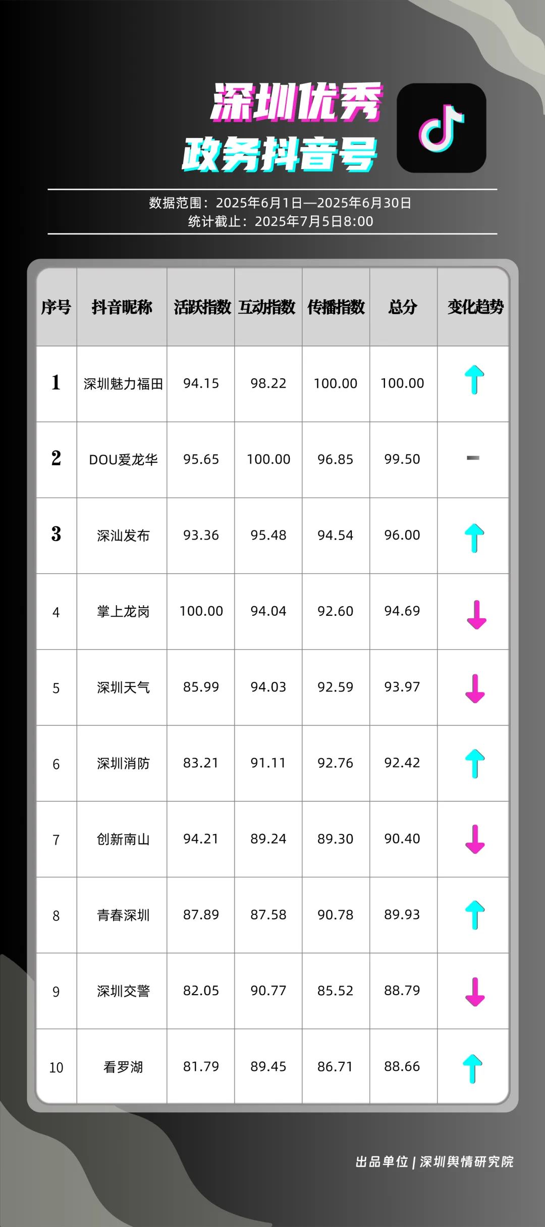 6月,“深圳魅力福田”“DOU愛(ài)龍華”“深汕發(fā)布”“掌上龍崗”“深圳天氣”“深圳消防”“創(chuàng)新南山”“青春深圳”“深圳交警”“看羅湖”共10個(gè)政務(wù)抖音號(hào)獲得“優(yōu)秀政務(wù)抖音號(hào)”稱(chēng)號(hào)。6月,“深圳魅力福田”登頂,憑借其城市人文、社會(huì)熱點(diǎn)類(lèi)主題短視頻,在傳播指數(shù)得分創(chuàng)新高;“DOU愛(ài)龍華”“深汕發(fā)布”“掌上龍崗”緊隨其后,通過(guò)各類(lèi)熱點(diǎn)、創(chuàng)意內(nèi)容提升傳播效能?!吧钲谔鞖狻薄吧钲谙馈币脖憩F(xiàn)突出,短視頻內(nèi)容兼具“信息傳遞”與“情感共鳴”,用戶參與度持續(xù)提升,不斷為網(wǎng)民傳播有價(jià)值的政務(wù)信息資訊。