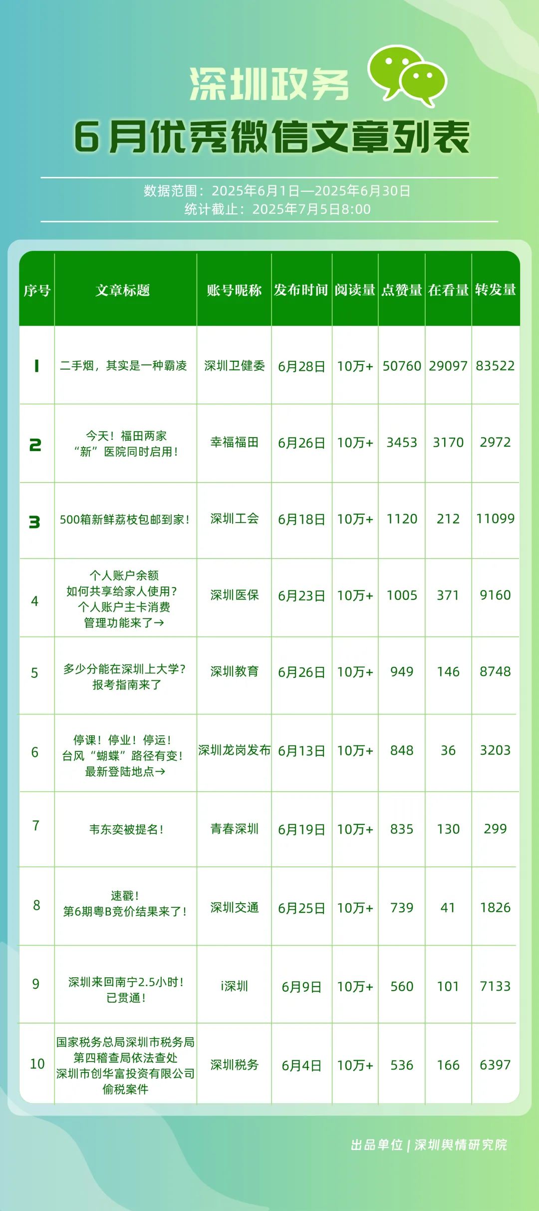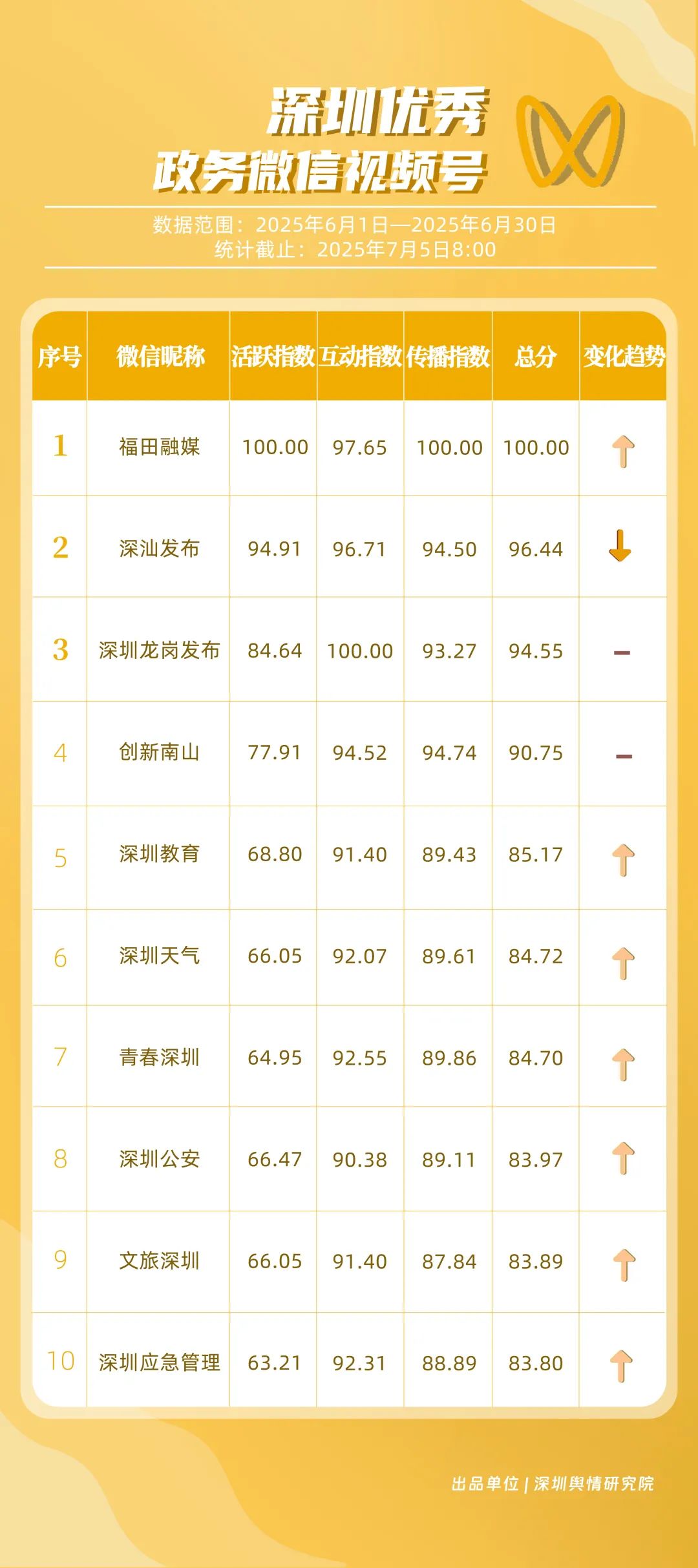 6月,“深圳天氣”“深圳衛(wèi)健委”“深圳消防”“深圳應(yīng)急管理”“創(chuàng)新南山”“深汕發(fā)布”“福田發(fā)布”“深圳公安”“深圳龍崗發(fā)布”“深圳交警”等20個(gè)賬號(hào)入選“優(yōu)秀政務(wù)微博號(hào)”。其中,“深圳天氣”以活躍、互動(dòng)指數(shù)雙滿分穩(wěn)居第一,氣象服務(wù)信息及時(shí)性與科普內(nèi)容趣味性獲市民高度認(rèn)可;“深圳衛(wèi)健委”“深圳消防”“深圳應(yīng)急管理”分別位列2至4位,通過(guò)熱點(diǎn)話題聯(lián)動(dòng)醫(yī)療、消防、應(yīng)急知識(shí)科普擴(kuò)大影響力,政務(wù)微博矩陣在突發(fā)事件響應(yīng)與民生服務(wù)中作用凸顯。