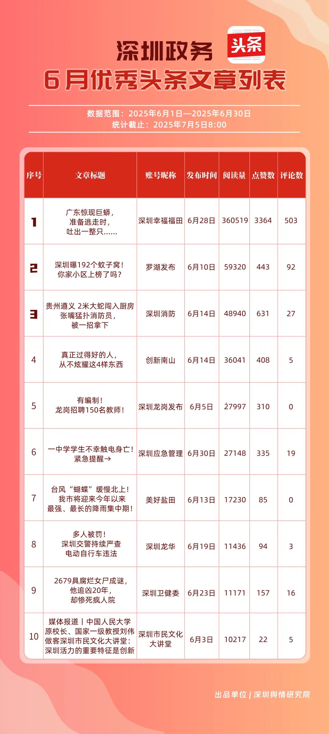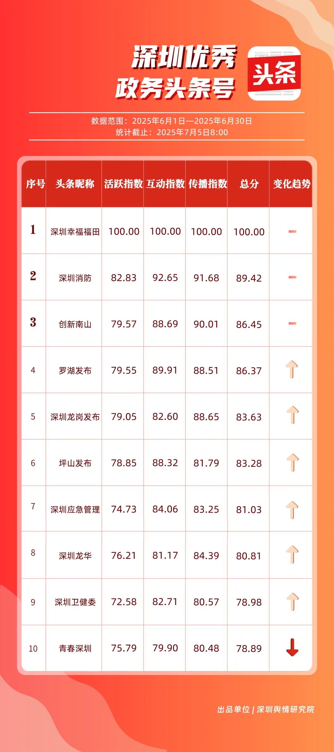 6月,“深圳幸福福田”“深圳消防”“創(chuàng)新南山”“羅湖發(fā)布”“深圳龍崗發(fā)布”“坪山發(fā)布”“深圳應(yīng)急管理”“深圳龍華”“深圳衛(wèi)健委”“青春深圳”共10個(gè)政務(wù)頭條號(hào)入選“優(yōu)秀政務(wù)頭條號(hào)”榜單?!吧钲谛腋8L铩薄吧钲谙馈薄皠?chuàng)新南山”連續(xù)位居榜單前3名,內(nèi)容具備較強(qiáng)的吸引力?!傲_湖發(fā)布”“深圳龍崗發(fā)布”排名也在榜單前列,排名較5月有所上升,在區(qū)域形象宣傳與民生服務(wù)中持續(xù)發(fā)力。