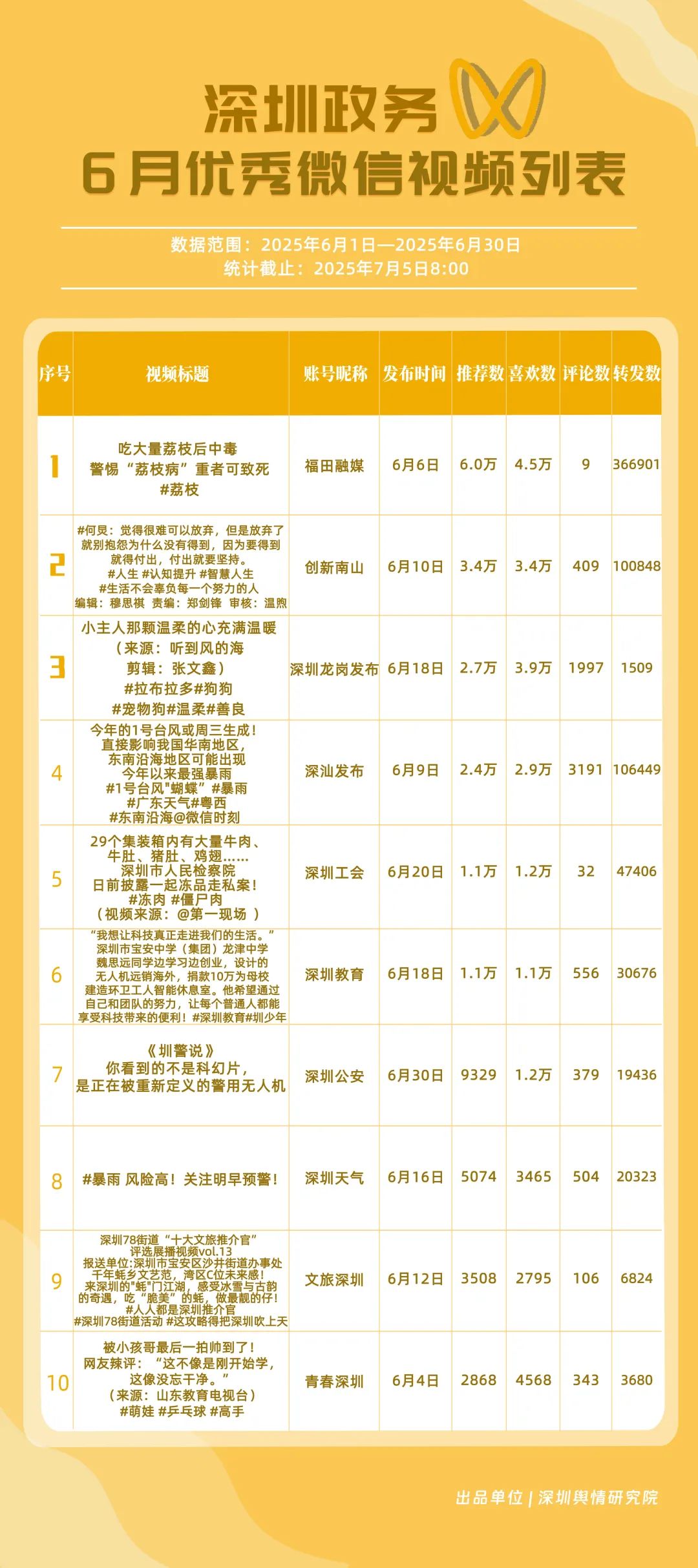 6月,獲得“深圳優(yōu)秀政務(wù)微信視頻號(hào)”稱(chēng)號(hào)的是“福田融媒”“深汕發(fā)布”“深圳龍崗發(fā)布”“創(chuàng)新南山”“深圳教育”“深圳天氣”“青春深圳”“深圳公安”“文旅深圳”“深圳應(yīng)急管理”。其中,“福田融媒”以活躍、傳播指數(shù)雙滿分居榜首,其視頻《吃大量荔枝后中毒 警惕“荔枝病”重者可致死》獲得超36萬(wàn)次轉(zhuǎn)發(fā),成為爆款案例;“深汕發(fā)布”“深圳龍崗發(fā)布”“創(chuàng)新南山”得分在90分以上,在互動(dòng)、傳播方面表現(xiàn)亮眼。這些優(yōu)秀的政務(wù)微信視頻號(hào)以各自的獨(dú)特風(fēng)格持續(xù)發(fā)力,為政務(wù)及民生信息傳遞開(kāi)拓更鮮活、暢通的路徑。