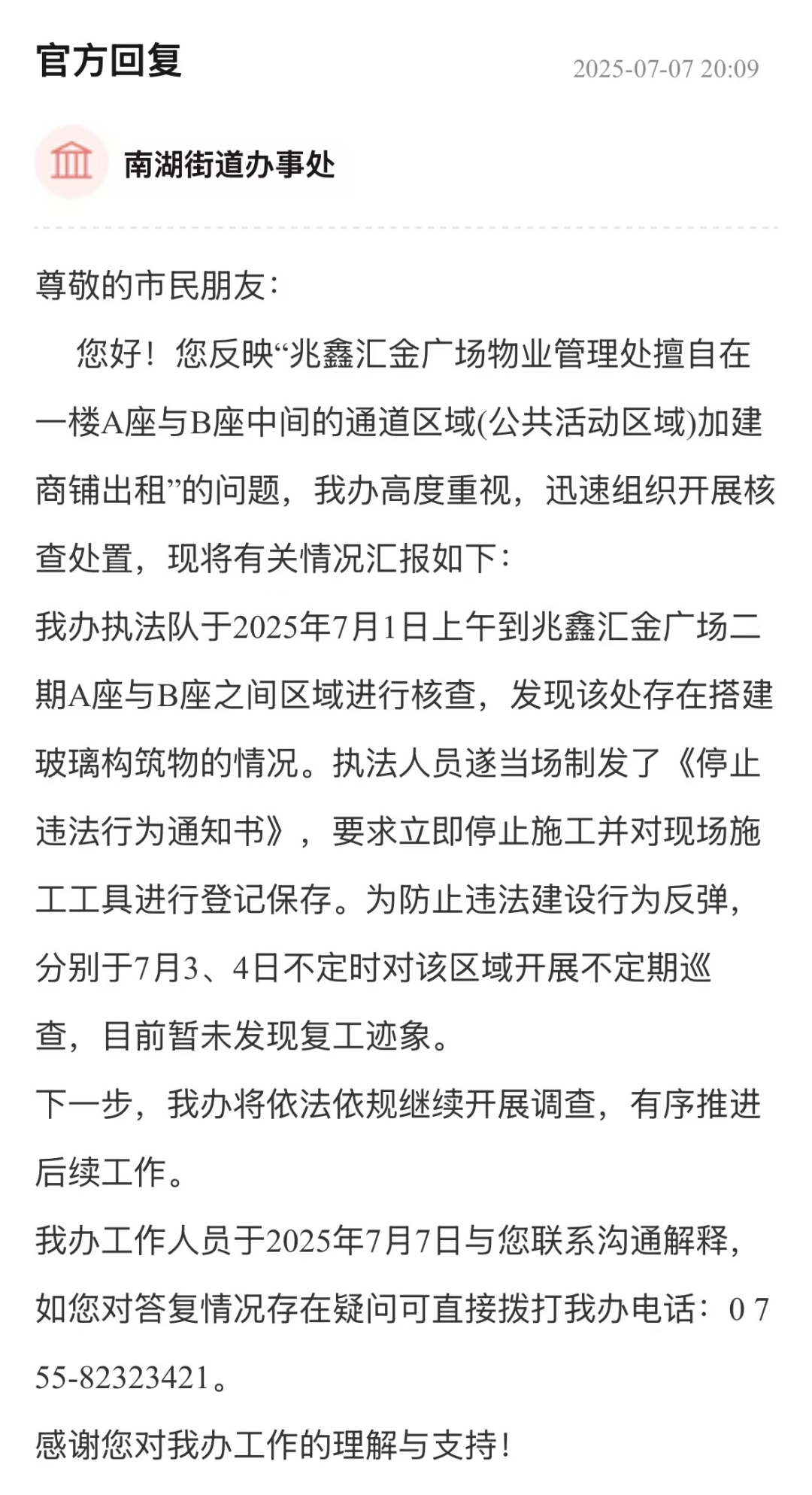 從市民反饋到執(zhí)法處置,羅湖區(qū)南湖街道辦事處以快速響應(yīng)、精準(zhǔn)執(zhí)法展現(xiàn)治理效能。通過現(xiàn)場核查、制發(fā)《停止違法行為通知書》、登記保存施工工具等措施,及時遏制違法搭建勢頭,并建立不定期巡查機(jī)制防止反彈。從“即時制止”到“長效監(jiān)督”的閉環(huán)管理,維護(hù)了業(yè)主合法權(quán)益與消防通道安全,為城市違建治理提供了高效務(wù)實(shí)的實(shí)踐樣本,彰顯基層執(zhí)法部門守護(hù)民生安全的責(zé)任擔(dān)當(dāng)。