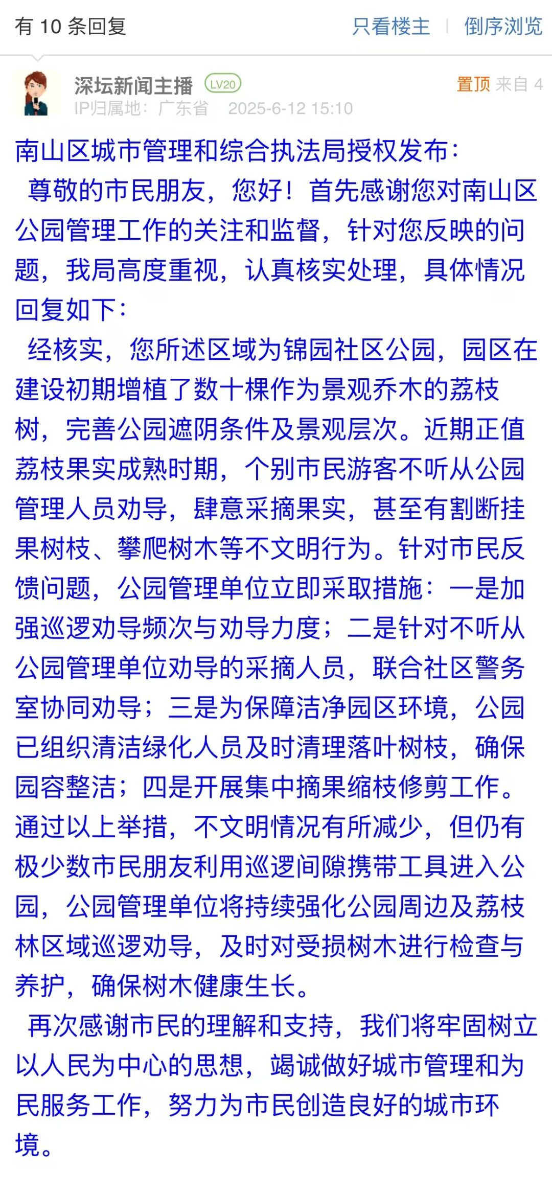 案例點(diǎn)評:接到市民反映問題后,南山區(qū)城市管理和綜合執(zhí)法局以快速響應(yīng)展現(xiàn)責(zé)任擔(dān)當(dāng)。通過“強(qiáng)化巡邏”“聯(lián)動執(zhí)法”“環(huán)境清理”“科學(xué)修剪”四大舉措,遏制采摘亂象,最大程度地保障樹木健康與園區(qū)整潔。該部門將動態(tài)監(jiān)督機(jī)制與跨部門協(xié)作相結(jié)合,及時化解民生問題,為城市公共資源保護(hù)提供了可借鑒的治理范式。