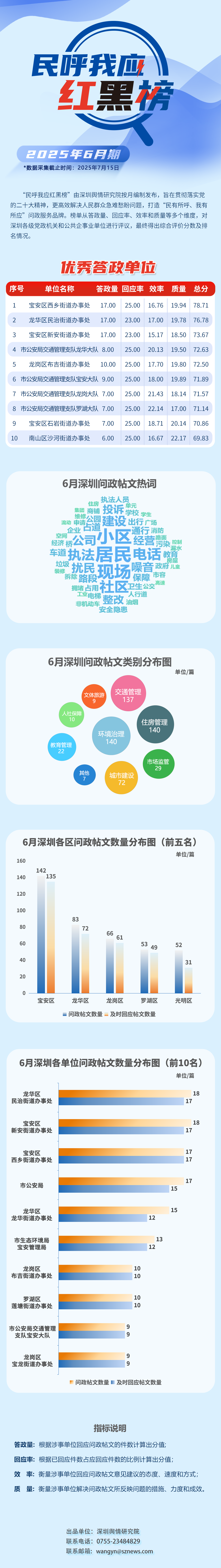 本期榜單采集的帖文主要來自深圳市及各區(qū)政府官網(wǎng)、深圳論壇、人民網(wǎng)領(lǐng)導(dǎo)留言板、深圳新聞網(wǎng)“民呼我應(yīng)”等平臺,所采集帖文發(fā)布時間為2025年6月1日至6月30日,采集截止時間為2025年7月15日。