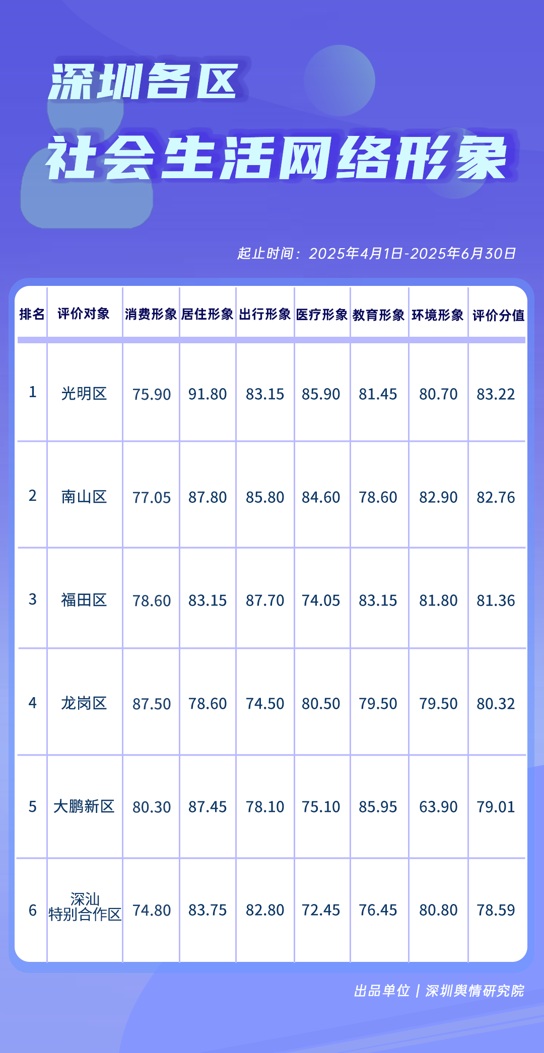 4-6月,《深圳各區(qū)社會(huì)生活網(wǎng)絡(luò)形象榜》中,光明區(qū)憑借在居住、醫(yī)療、出行等多方面的良好網(wǎng)絡(luò)呈現(xiàn),獲得較高綜合評(píng)價(jià)分值,南山區(qū)、福田區(qū)、龍崗區(qū)也表現(xiàn)優(yōu)異,四區(qū)綜合評(píng)價(jià)分值均超80分。大鵬新區(qū)、深汕特別合作區(qū)也在榜單中占據(jù)靠前位置,成為各區(qū)借助網(wǎng)絡(luò)力量增進(jìn)民生福祉、推動(dòng)協(xié)調(diào)發(fā)展的生動(dòng)展現(xiàn)。