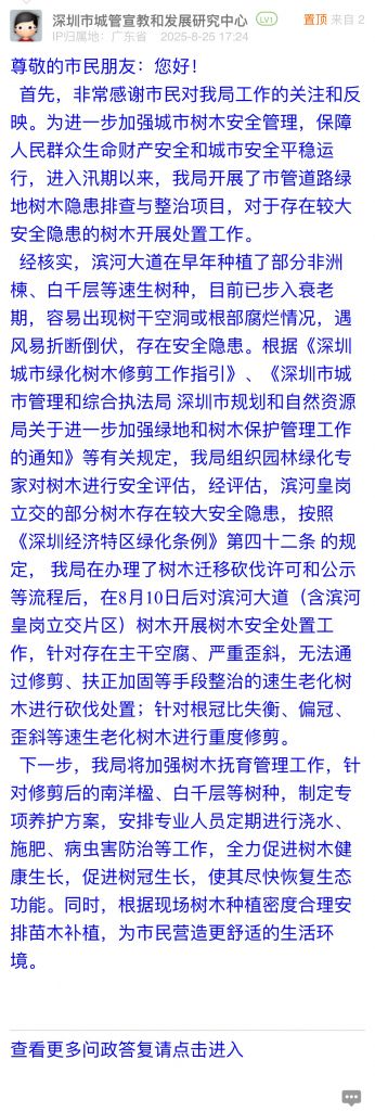 首先,非常感謝市民對我局工作的關(guān)注和反映。為進(jìn)一步加強(qiáng)城市樹木安全管理,保障人民群眾生命財(cái)產(chǎn)安全和城市安全平穩(wěn)運(yùn)行,進(jìn)入汛期以來,我局開展了市管道路綠地樹木隱患排查與整治項(xiàng)目,對于存在較大安全隱患的樹木開展處置工作。
