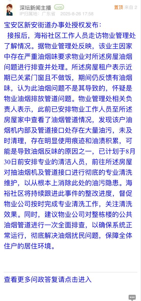 接報(bào)后,海裕社區(qū)工作人員走訪物業(yè)管理處了解情況。據(jù)物業(yè)管理處反映,該業(yè)主因家中存在嚴(yán)重油煙味要求物業(yè)對所述房屋油煙問題進(jìn)行排查并處理。所述房屋租戶表示近期已關(guān)緊門窗且不做飯,期間仍反饋有油煙味,認(rèn)為此油煙問題不是其導(dǎo)致的,懷疑是物業(yè)油煙排放管道問題。物業(yè)管理處相關(guān)負(fù)責(zé)人表示,此前已安排物業(yè)工作人員至所述房屋家中查看了油煙管道情況,發(fā)現(xiàn)該戶油煙機(jī)內(nèi)部及管道接口處存在大量油污,未及時(shí)清理,存在明顯使用痕跡和油漬積累,可能是導(dǎo)致油煙反味的原因之一,已計(jì)劃于8月30日前安排專業(yè)的清潔人員,前往所述房屋對抽油煙機(jī)及管道接口進(jìn)行徹底的專業(yè)清洗維護(hù),以從根本上消除此處的油污隱患。海裕社區(qū)將持續(xù)跟進(jìn)此事件的整改進(jìn)度,督促物業(yè)公司按時(shí)完成專業(yè)清洗工作,關(guān)注清洗效果。同時(shí),建議物業(yè)公司對整棟樓的公共油煙管道進(jìn)行一次全面排查,以確保系統(tǒng)正常運(yùn)行,徹底解決油煙擾民問題,保障全體住戶的居住環(huán)境。