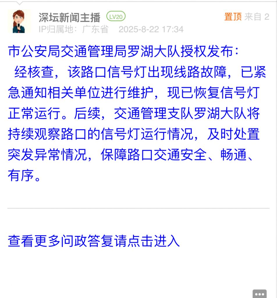 經(jīng)核查,該路口信號燈出現(xiàn)線路故障,已緊急通知相關(guān)單位進(jìn)行維護(hù),現(xiàn)已恢復(fù)信號燈正常運(yùn)行。后續(xù),交通管理支隊(duì)羅湖大隊(duì)將持續(xù)觀察路口的信號燈運(yùn)行情況,及時(shí)處置突發(fā)異常情況,保障路口交通安全、暢通、有序。