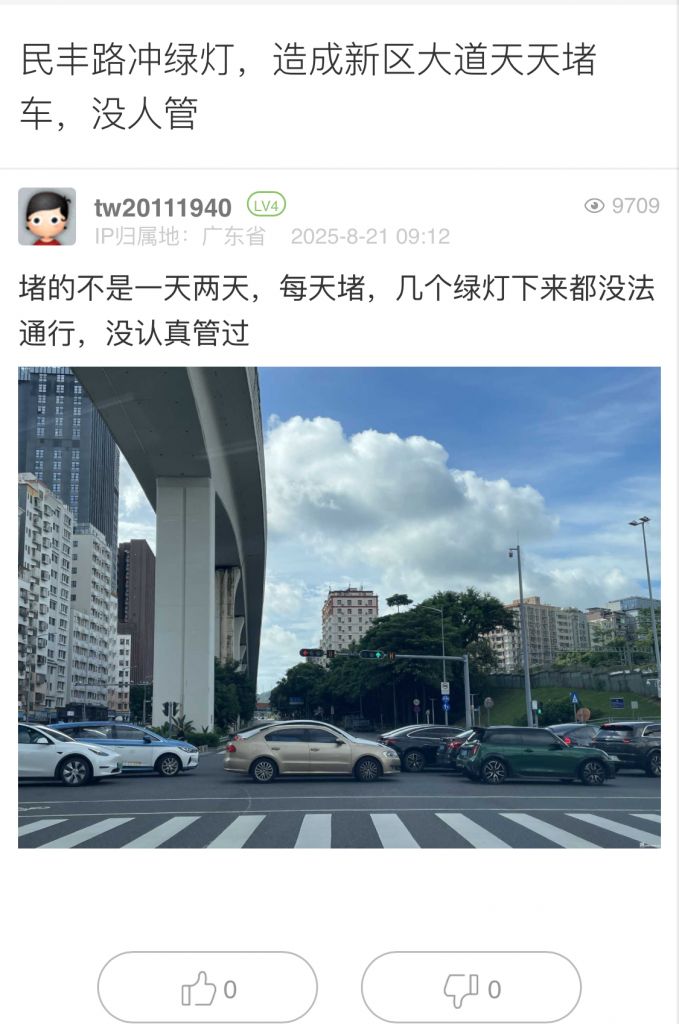 16. 帖文《民豐路沖綠燈,造成新區(qū)大道天天堵車,沒人管》