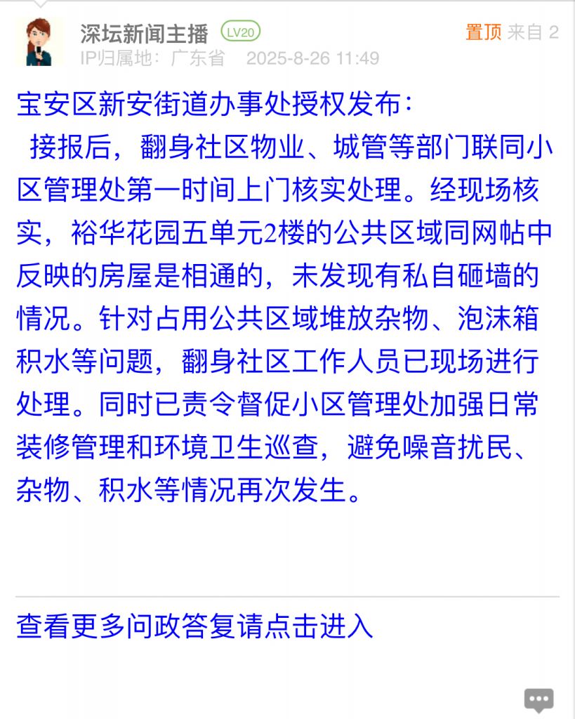 接報(bào)后,翻身社區(qū)物業(yè)、城管等部門聯(lián)同小區(qū)管理處第一時(shí)間上門核實(shí)處理。經(jīng)現(xiàn)場核實(shí),裕華花園五單元2樓的公共區(qū)域同網(wǎng)帖中反映的房屋是相通的,未發(fā)現(xiàn)有私自砸墻的情況。針對占用公共區(qū)域堆放雜物、泡沫箱積水等問題,翻身社區(qū)工作人員已現(xiàn)場進(jìn)行處理。同時(shí)已責(zé)令督促小區(qū)管理處加強(qiáng)日常裝修管理和環(huán)境衛(wèi)生巡查,避免噪音擾民、雜物、積水等情況再次發(fā)生。
