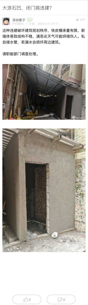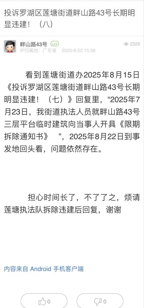 30. 帖文《投訴羅湖區(qū)蓮塘街道畔山路43號長期明顯違建!(八)》