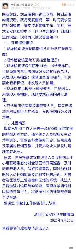 網(wǎng)友您好,您反映的問題已收悉,接到反映的情況后,我局高度重視,第一時(shí)間要求醫(yī)院加強(qiáng)巡查,落實(shí)控?zé)煿芾砉ぷ鳎煌瑫r(shí),要求寶安區(qū)疾控中心(區(qū)衛(wèi)生監(jiān)督所)到現(xiàn)場進(jìn)行調(diào)查。現(xiàn)將有關(guān)情況答復(fù)如下: