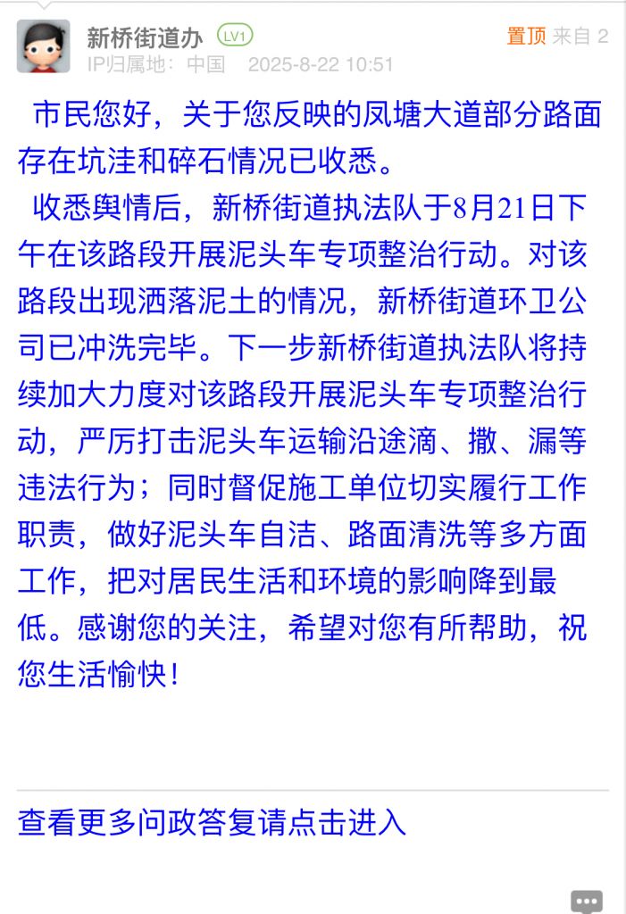 收悉輿情后,新橋街道執(zhí)法隊(duì)于8月21日下午在該路段開展泥頭車專項(xiàng)整治行動(dòng)。對該路段出現(xiàn)灑落泥土的情況,新橋街道環(huán)衛(wèi)公司已沖洗完畢。下一步新橋街道執(zhí)法隊(duì)將持續(xù)加大力度對該路段開展泥頭車專項(xiàng)整治行動(dòng),嚴(yán)厲打擊泥頭車運(yùn)輸沿途滴、撒、漏等違法行為;同時(shí)督促施工單位切實(shí)履行工作職責(zé),做好泥頭車自潔、路面清洗等多方面工作,把對居民生活和環(huán)境的影響降到最低。感謝您的關(guān)注,希望對您有所幫助,祝您生活愉快!
