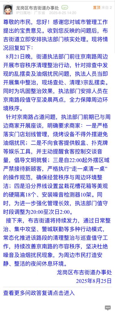接下來,布吉街道將持續(xù)發(fā)力,通過日常整治、集中攻堅(jiān)、警城聯(lián)勤等多種行動(dòng)模式,常態(tài)化推進(jìn)該路段的清理整治與巡查值守工作,持續(xù)改善京南路的市容秩序,堅(jiān)決杜絕噪音及油煙擾民現(xiàn)象,為周邊市民打造安靜、整潔的夜間休息環(huán)境。