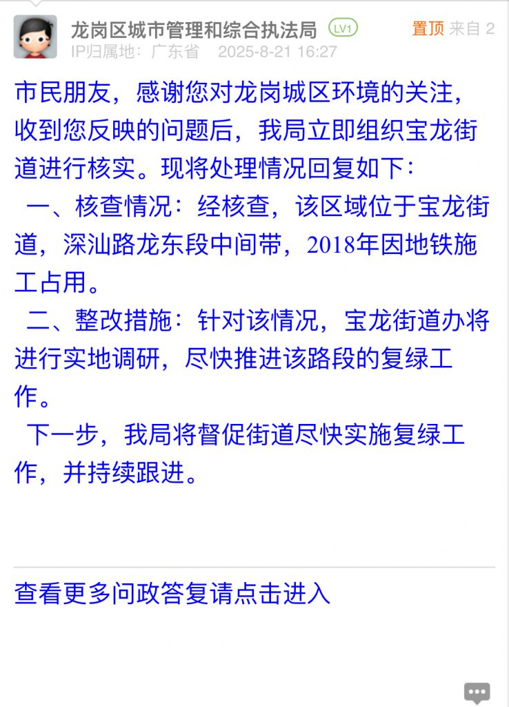 市民朋友,感謝您對龍崗城區(qū)環(huán)境的關(guān)注,收到您反映的問題后,我局立即組織寶龍街道進(jìn)行核實(shí)。現(xiàn)將處理情況回復(fù)如下: