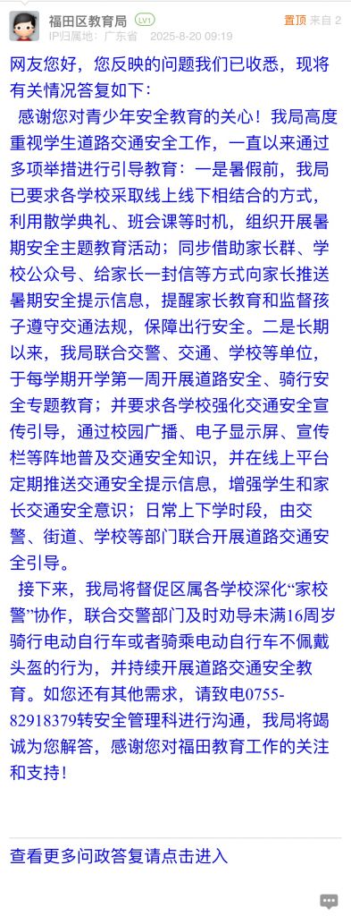 接下來,我局將督促區(qū)屬各學(xué)校深化“家校警”協(xié)作,聯(lián)合交警部門及時(shí)勸導(dǎo)未滿16周歲騎行電動(dòng)自行車或者騎乘電動(dòng)自行車不佩戴頭盔的行為,并持續(xù)開展道路交通安全教育。如您還有其他需求,請致電0755-82918379轉(zhuǎn)安全管理科進(jìn)行溝通,我局將竭誠為您解答,感謝您對福田教育工作的關(guān)注和支持!