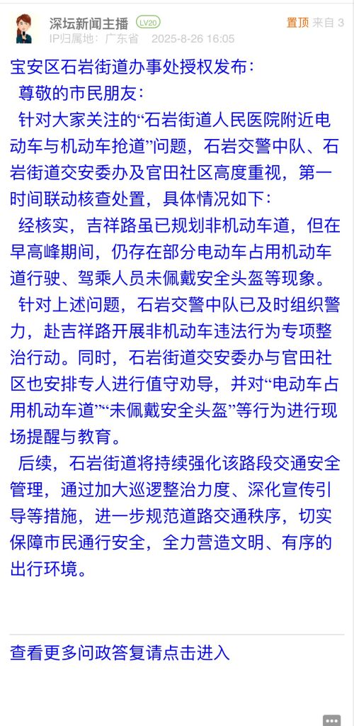 針對大家關(guān)注的“石巖街道人民醫(yī)院附近電動(dòng)車與機(jī)動(dòng)車搶道”問題,石巖交警中隊(duì)、石巖街道交安委辦及官田社區(qū)高度重視,第一時(shí)間聯(lián)動(dòng)核查處置,具體情況如下: