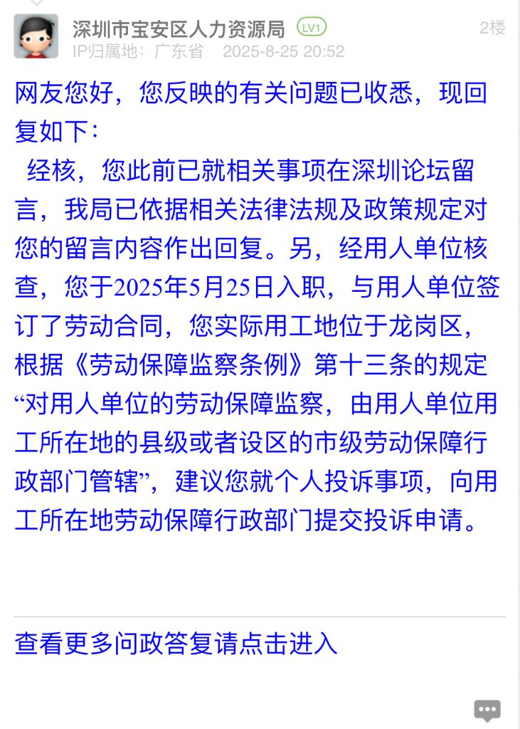 經(jīng)核,您此前已就相關(guān)事項(xiàng)在深圳論壇留言,我局已依據(jù)相關(guān)法律法規(guī)及政策規(guī)定對您的留言內(nèi)容作出回復(fù)。另,經(jīng)用人單位核查,您于2025年5月25日入職,與用人單位簽訂了勞動(dòng)合同,您實(shí)際用工地位于龍崗區(qū),根據(jù)《勞動(dòng)保障監(jiān)察條例》第十三條的規(guī)定“對用人單位的勞動(dòng)保障監(jiān)察,由用人單位用工所在地的縣級或者設(shè)區(qū)的市級勞動(dòng)保障行政部門管轄”,建議您就個(gè)人投訴事項(xiàng),向用工所在地勞動(dòng)保障行政部門提交投訴申請。