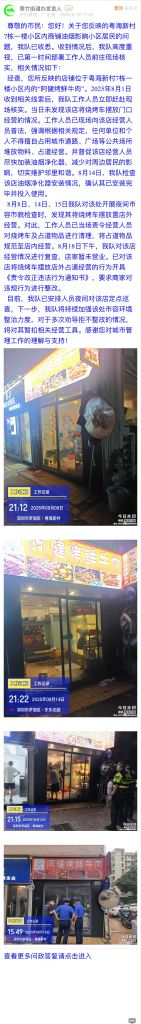 經(jīng)查,您所反映的店鋪位于粵海新村7棟一樓小區(qū)內(nèi)的“阿健烤鮮牛肉”。2025年8月1日收到相關(guān)線索后,我隊(duì)工作人員立即趕赴現(xiàn)場核實(shí)。當(dāng)日未發(fā)現(xiàn)該店將燒烤車擺放門口經(jīng)營的情況。工作人員已現(xiàn)場向該店經(jīng)營人員普法,強(qiáng)調(diào)根據(jù)相關(guān)規(guī)定,任何單位和個(gè)人不得擅自占用城市道路、廣場等公共場所堆放物料、占道經(jīng)營。并督促該店經(jīng)營人員盡快加裝油煙凈化器,減少對周邊居民的影響,切實(shí)維護(hù)鄰里和諧。8月14日,我隊(duì)檢查該店油煙凈化器安裝情況,確認(rèn)其已安裝完畢并投入使用。